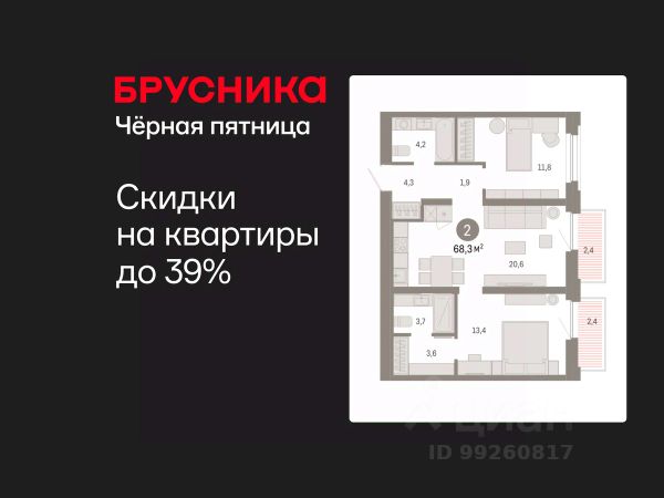 Квартира в счёт первоначального взноса по программе обмена. По всем вопросам звоните в офис продаж, мы вам все подробно расскажем! Просторная 2-комн. квартира с предчистовой отделкой в ЖК "Республики 205" на 2 этаже. Общая площадь: 68.59 кв.м. Высота потолков 2.7 м. Купить квартиру можно с помощью программ покупки от застройщика Брусника: - ипотека по эксклюзивной ставке с помощью в получении положительного кредитного решения через сервис ипотечный брокер; - квартиры в рассрочку без процентов от застройщика Брусника; - обмен квартиры на новую. Получить одобрение ипотеки или рассрочку, а также осуществить обмен квартир можно онлайн. Дом монолитный, многоподъездный, переменной этажности, от 7 до 16 этажей. Квартира находится в 1-й секции высотой 9 этажей в корпусе 2. На этаже 10 квартир. В подъезде 1 грузовой лифт. Начало строительства - 1 квартал 2024 года. Окончание строительства - 1 квартал 2026 года. Оформление сделки по договору долевого участия. Район Проект расположен в границах улиц Пермякова, Энергетиков, Воровского и Республики. До центра города — 10 минут на машине. Рядом — автомобильная развязка на пересечении улиц Пермякова и Республики. В шаговой доступности есть школы, детские сады, поликлиники, крупный торговый центр, автовокзал и несколько скверов. Проект "Республики 205" — это проект комплексного развития территории, уникальный по своему наполнению. Переосмысляя бывшую территорию завода медицинского оборудования, мы создадим новое место силы — микрорайон, насыщенный деловой, развлекательной, рекреационной, игровой, образовательной и медицинской инфраструктурой. До каждого полезного сервиса здесь можно будет дойти за 15 минут. Локальными центрами "Республики 205" будут общественные пространства — скверы, парки, бульвары и площади. В границах нашего участка мы намерены разместить школу, рассчитанную на 1550 учеников, два детских сада на 300 мест и встроенный детский сад на 100 мест. В одном из цехов бывшего завода расположится креативный кластер "Кузница". Он станет площадкой для нескольких институций — галереи, лектория, книжного магазина-библиотеки, кинобара и точек креативного pop-up-ритейла. Пешеходные бульвары внутри района соединят между собой улицу ресторанов, детские и спортивные площадки, событийную площадь и летний кинотеатр. Идентификатор квартиры по базе застройщика: РСП-02-1-1. #z5mews 2-комнатная квартира в новостройке с отделкой в Тюменской области.