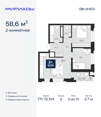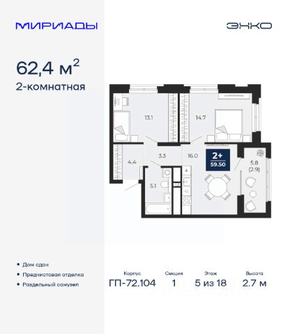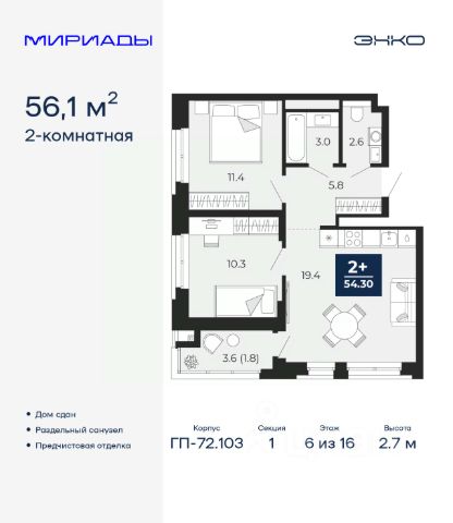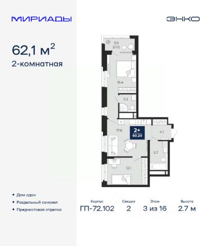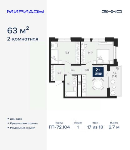 Спешите забронировать по акционной цене, предложение ограничено! Стоимость квартиры указана со скидкой, ваша экономия составит 318,888 руб. Информация по телефону, мы вам все подробно расскажем. Двухкомнатная квартира с европланировкой и предчистовой отделкой в ЖК "Мириады" на 1 этаже. Общая площадь: 40.7 кв.м., жилая: 20.7 кв.м., общая площадь гостиной-столовой с кухонной зоной: 15.4 кв.м. Европейская планировка, кухня-гостиная - идеальный вариант для тех, кто любит часто принимать гостей. Комнаты изолированные, все окна выходят на одну сторону. В квартире одна лоджия, один совмещенный санузел. Высота потолков 2.7 м. Дом монолитный, двухподъездный, переменной этажности, от 14 до 18 этажей. Квартира находится во 2-й секции высотой 14 этажей в корпусе ГП-72.104. На этаже 8 квартир. В подъезде 1 пассажирский и 1 грузовой лифт. На сегодняшний день строительство завершено, дом сдан в 4 квартале 2025 года. Оформление сделки по договору купли-продажи. Вселенная бесконечных историй. Ранее невиданный Тюмени масштаб: территория 240 гектаров и 1 650 000 м² застройки. Мириады это город масштабных перемен и больших возможностей. Город зеленых рощ и зеркальных озер. Город для работы, учебы и развлечений. Город для детей и их родителей. Город для всех и каждого. Проект расположен в районе Мыс рядом с ТРЦ "Тюмень Сити Молл" в границах улицы Тимофея Чаркова, Тобольского тракта и объездной дороги. Срок полного освоения территории - до 2034 года. #267dCv 2-комнатная квартира в новостройке с отделкой в Тюменской области.