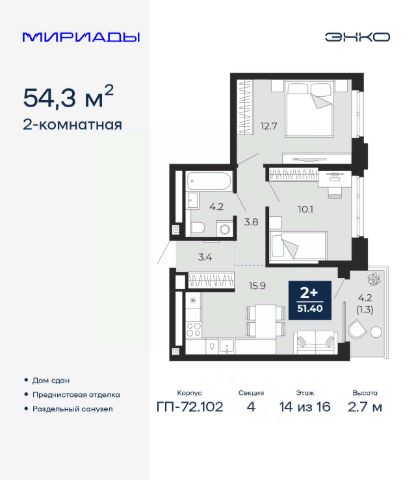 Торопитесь забронировать на этих условиях, предложение ограничено! Стоимость квартиры указана со скидкой, ваша экономия составит 318,888 руб. Звоните, мы вам все подробно расскажем. 2-комн. квартира с европланировкой и предчистовой отделкой в ЖК "Мириады" на 1 этаже. Общая площадь: 40.7 кв.м., жилая: 20.7 кв.м., общая площадь гостиной-столовой с кухонной зоной: 15.4 кв.м. Европланировка, кухня-гостиная - идеальный вариант для тех, кто любит часто принимать гостей. Комнаты изолированные, все окна выходят на одну сторону. В квартире одна лоджия, один совмещенный санузел. Высота потолков 2.7 м. Дом монолитный, двухподъездный, переменной этажности, от 14 до 18 этажей. Квартира находится во 2-й секции высотой 14 этажей в корпусе ГП-72.104. На этаже 8 квартир. В подъезде 1 пассажирский и 1 грузовой лифт. На сегодняшний день строительство окончено, дом сдан в 4 квартале 2025 года. Оформление сделки по договору купли-продажи. Вселенная бесконечных историй. Ранее невиданный Тюмени масштаб: территория 240 гектаров и 1 650 000 м² застройки. Мириады это город масштабных перемен и больших возможностей. Город зеленых рощ и зеркальных озер. Город для работы, учебы и развлечений. Город для детей и их родителей. Город для всех и каждого. Проект расположен в районе Мыс рядом с ТРЦ "Тюмень Сити Молл" в границах улицы Тимофея Чаркова, Тобольского тракта и объездной дороги. Срок полного освоения территории - до 2034 года. #ZmTDc8 2-комнатная квартира в новостройке с отделкой в Тюменской области.