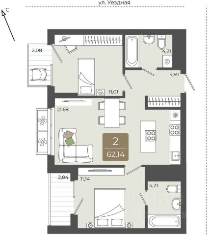 Продаётся квартира площадью 56 м2 в жилом комплексе "Айрис". Квартира находится на 3 этаже, жилая площадь квартиры 22.9 м2, площадь просторной кухни — 19.4 м2. Среди особенностей планировки — изолированные комнаты с окнами на одну сторону, 1 совмещённый санузел. Срок сдачи — III кв. 2027 Жилой комплекс "Айрис" — это: - фиджитал-квартал в Тюмени - дома высотой от 7 до 25 этажей - квартиры с системой "Умный дом" - цифровые технологии как элемент благоустройства Окружение В нескольких минутах ходьбы от дома — парк "Комарово" с волейбольной площадкой, открытым кинотеатром, зонами для барбекю и катком. Неподалеку от Айрис находится центр иппотерапии, где можно покататься на лошадях и взять уроки верховой езды. На территории Айрис появится собственный парк с прогулочными аллеями. Инфраструктура В 5-10 минутах от квартала открыты 2 детских сада и гимназия. На шопинг можно отправиться в торговые комплексы "Колумб" и "Кристалл" — они находятся недалеко от дома. Благоустройство Уютный двор — приватное пространство для жителей. В беседках можно будет почитать книгу в тишине, а в тени деревьев устроиться на пикник. На крыше многоуровневого паркинга будет лаунж-зона с кинотеатром, баскетбольная площадка и воркаут-пространство, где можно позаниматься с виртуальным тренером — достаточно отсканировать код. Лобби Интерьеры лобби выполнены в пастельных тонах с элементами фиджитал-решений. Для отдыха и ожидания гостей создана лаунж-зона. Также есть гостевые санузлы. Колясочные Возвращайтесь налегке после прогулки с малышом — оставить коляску можно в специальном помещении на первом этаже. Кладовые Для сезонных и габаритных вещей предусмотрены отдельные кладовые на цокольном этаже. В каждом помещении уже проведено электричество и выполнена стяжка пола. Паркинг На территории — два многоуровневых наземных паркинга. Один из них примыкает к домам — из него можно напрямую пройти в парадные. Планировки Планировки квартала — от компактной студии до сити-хауса с собственным палисадником — соответствуют любым жизненным сценариям. Можно выбрать квартиры с террасами и готовыми дизайнерскими интерьерами. Продам 2-комнатную квартиру в новостройке в округе Калининский в городе Тюмень.