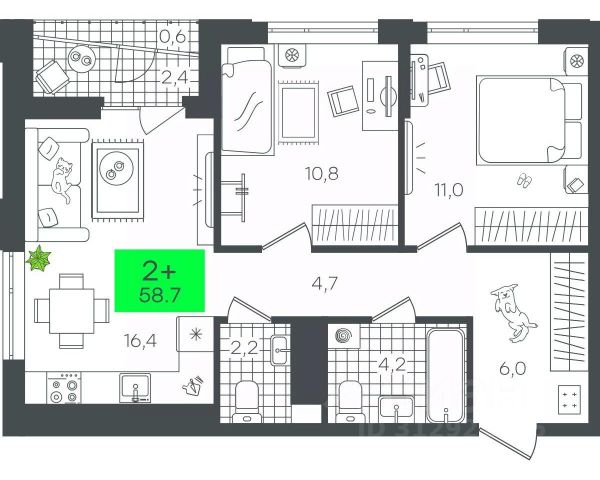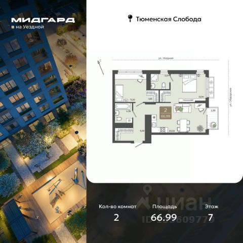 Двухкомнатная квартира с предчистовой отделкой в ЖК "Мотивы" на 3 этаже. Общая площадь: 65.31 кв.м., жилая: 27.77 кв.м., площадь просторной кухни-столовой: 16.17 кв.м. Квартира - распашонка, без проходных комнат, окна выходят на paзные стороны дома. В квартире две лоджии, два совмещенных санузла. Высота потолков 2.7 м.