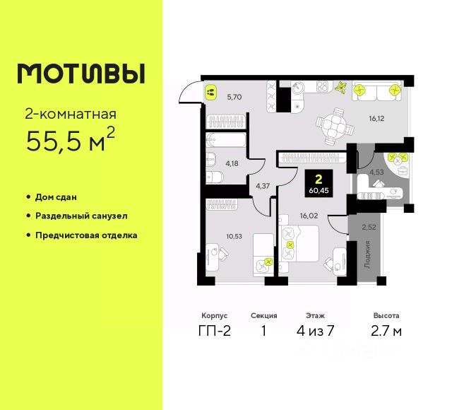 Квартира с кухней-гостиной и двумя спальнями в Октябрьском на Туре. Особенности планировки: балкон, вид во двор, мастер-спальня, предчистовая отделка. квартиры в нашей базе: КО-07.2-1-1.9.9. Район Проект расположен на берегу реки, в одном из самых живописных и экологичных районов Тюмени. За последние годы облик района изменился. По соседству с индивидуальной застройкой выросли многоквартирные дома. При проектировании "Октябрьского на Туре" нашей приоритетной задачей стало сохранение природного ландшафта: мы постарались деликатно вписать в него современную архитектуру. Квартал удачно расположен с точки зрения дорожной инфраструктуры. На автомобиле путь до центра города составит 15 минут. Добраться до набережной и главных тюменских достопримечательностей можно и на общественном транспорте. В пешей доступности находится автобусная остановка. Проект По мастер-плану здесь будет восемь домов. Ядро застройки составляют замкнутые кварталы переменной этажности. Их высотность понижается по мере приближения к реке. На углах участка мы разместили башни-доминанты. Одной из достопримечательностей квартала станет парк на Туре — здесь появится зеленая зона протяженностью около 6 километров для пеших и велопрогулок. Смысловая ось квартала — широкая главная улица с высаженными вдоль неё высокими деревьями. Они создают тень и работают как шумо- и пылезащитные экраны. Это место сосредоточения основных пешеходных и транспортных потоков, на сторону которых мы ориентировали большинство коммерческих помещений. Отсюда жители могут свернуть на тихие соседские улицы и попасть на внутриквартальную площадь — ещё одну точку притяжения. #1F3A5A Продам 2-комнатную квартиру в новостройке в округе Калининский в городе Тюмень.