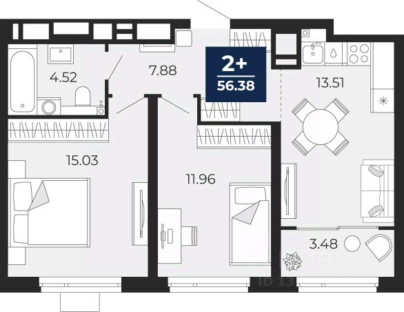 2-комн. квартира с предчистовой отделкой в ЖК "Мотивы" на 13 этаже. Общая площадь: 59.93 кв.м., жилая: 22.9 кв.м., площадь просторной кухни-столовой: 19.15 кв.м. Угловая квартира, очень светлая, естественная вентиляция при открытии окон. В квартире одна лоджия, один совмещенный и один раздельный санузел. Высота потолков 2.7 м.