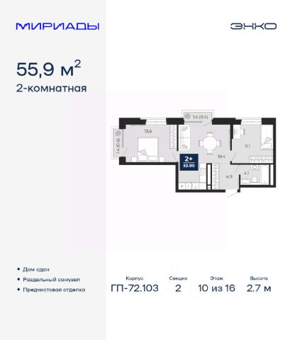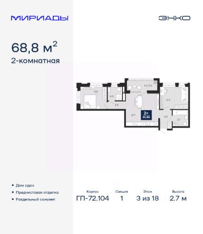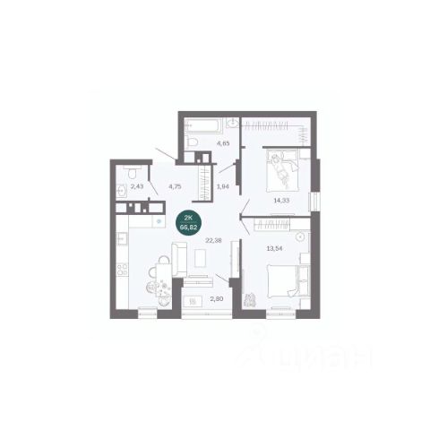 Просторная 2-комн. квартира с предчистовой отделкой в ЖК "Республики 205" на 9 этаже. Общая площадь: 60.13 кв.м., жилая: 24 кв.м., площадь просторной кухни-гостиной: 17.8 кв.м. Комнаты изолированные, все окна выходят на одну сторону. В квартире одна лоджия, один совмещенный и один раздельный санузел. Высота потолков 2.6 м.