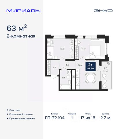 Спешите забронировать по акционной цене, срок акции ограничен! Стоимость квартиры указана со скидкой, ваша экономия составит 3,230,000 руб. Квартира в рассрочку без процентов от застройщика. Эксклюзивные ипотечные условия. Дом будет сдан в 4 квартале 2025 года. Информация по телефону, наши менеджеры вам все расскажут. Двухкомнатная квартира с предчистовой отделкой в ЖК "Республики 205" на 9 этаже. Общая площадь: 60.2 кв.м., жилая: 24 кв.м., площадь просторной кухни-гостиной: 17.8 кв.м. Комнаты изолированные, все окна выходят на одну сторону. В квартире одна лоджия, один совмещенный и один раздельный санузел. Высота потолков 2.6 м. Купить квартиру можно с помощью программ покупки от застройщика Брусника: - ипотека по эксклюзивной ставке с помощью в получении положительного кредитного решения через сервис ипотечный брокер; - квартиры в рассрочку без процентов от застройщика Брусника; - обмен квартиры на новую. Получить одобрение ипотеки или рассрочку, а также осуществить обмен квартир можно онлайн. Дом монолитный, многоподъездный, переменной этажности, от 9 до 17 этажей. Квартира находится в 5-й секции высотой 9 этажей в корпусе 1. На этаже 6 квартир. В подъезде 1 грузовой лифт. Начало строительства - 2 квартал 2023 года. На сегодняшний день строительство окончено, дом сдан в 4 квартале 2025 года. Оформление сделки по договору купли-продажи. Район Проект расположен в границах улиц Пермякова, Энергетиков, Воровского и Республики. До центра города — 10 минут на машине. Рядом — автомобильная развязка на пересечении улиц Пермякова и Республики. В шаговой доступности есть школы, детские сады, поликлиники, крупный торговый центр, автовокзал и несколько скверов. Проект "Республики 205" — это проект комплексного развития территории, уникальный по своему наполнению. Переосмысляя бывшую территорию завода медицинского оборудования, мы создадим новое место силы — микрорайон, насыщенный деловой, развлекательной, рекреационной, игровой, образовательной и медицинской инфраструктурой. До каждого полезного сервиса здесь можно будет дойти за 15 минут. Локальными центрами "Республики 205" будут общественные пространства — скверы, парки, бульвары и площади. В границах нашего участка мы намерены разместить школу, рассчитанную на 1550 учеников, два детских сада на 300 мест и встроенный детский сад на 100 мест. В одном из цехов бывшего завода расположится креативный кластер "Кузница". Он станет площадкой для нескольких институций — галереи, лектория, книжного магазина-библиотеки, кинобара и точек креативного pop-up-ритейла. Пешеходные бульвары внутри района соединят между собой улицу ресторанов, детские и спортивные площадки, событийную площадь и летний кинотеатр. Идентификатор квартиры по базе застройщика: МЕД01-01-5-5. #219I9u Продам 2-комнатную квартиру в новостройке в округе Ленинский в городе Тюмень.