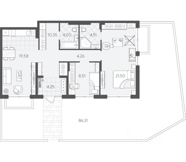 Прямая продажа от застройщика! Продается трёхкомнатная квартира в строящемся ЖК "Меридиан Слобода", срок сдачи: I-кв. 2027, общей площадью 74.74 м², на 11 этаже из 21. Площадь кухни — 20.32 м².
