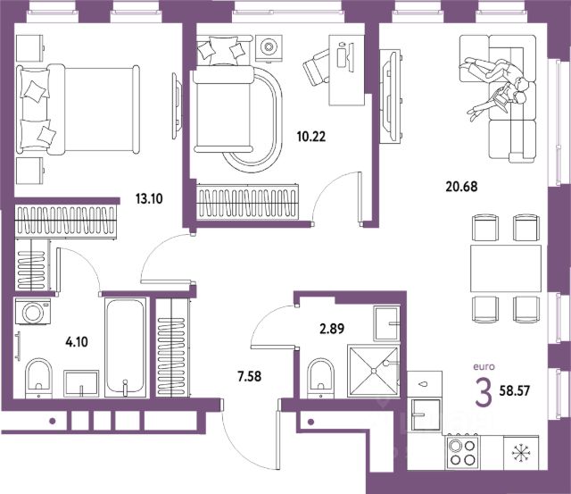 2-комн. квартира от застройщика с предчистовой отделкой в ЖК "Мотивы" на 12 этаже. Общая площадь: 59.8 кв.м., жилая: 25.3 кв.м., площадь просторной кухни-столовой: 15.7 кв.м. Квартира - распашонка, без проходных комнат, окна выходят на paзные стороны дома. В квартире один балкон и одна лоджия, два совмещенных санузла. Высота потолков 2.7 м.