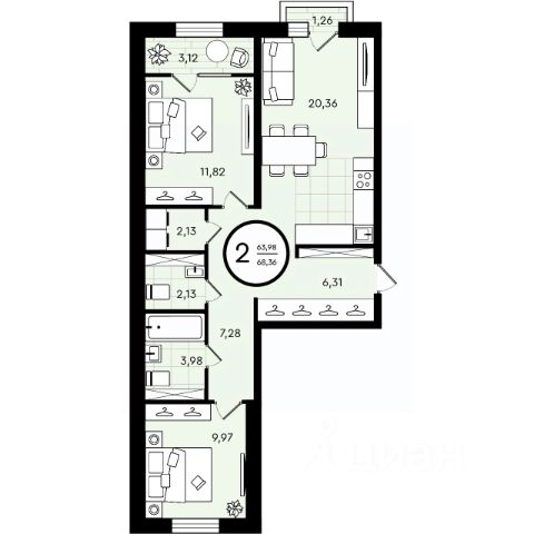 Продается 2-комн. квартира от застройщика с предчистовой отделкой в ЖК "Республики 205" на 16 этаже. Общая площадь: 60.68 кв.м., жилая: 21.4 кв.м., площадь просторной кухни-гостиной: 18.3 кв.м. Квартира угловая, очень светлая, естественная вентиляция при открытии окон. В квартире одна лоджия, один совмещенный и один раздельный санузел. Высота потолков 2.6 м.