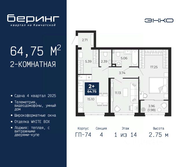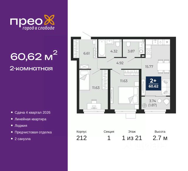 Продаётся квартира площадью 76.99 м2 в жилом комплексе "Дабл-Дабл". Квартира находится на 11 этаже, жилая площадь квартиры 28.12 м2, площадь просторной кухни — 22.69 м2. Среди особенностей планировки — изолированные комнаты с окнами на одну сторону, 1 совмещённый санузел. Срок сдачи — II кв. 2028 Жилой комплекс "Дабл-Дабл" — это: - проект комфорт-класса на Московском тракте - дома высотой 15 этажей - квартиры от 1-комнатных до 2-уровневых Окружение На границе жилого комплекса — живописный лес. Достаточно открыть окна, чтобы впустить в комнаты ароматы зелени, прохладу и чистый воздух. Благоустройство Юные жители оценят игровые площадки и воркаут-зоны. Любителям неспешных прогулок понравится 2-уровневый променад с панорамным видом и навесами. Лобби Помещения встречают дизайнерскими интерьерами с уютными лаунж-зонами, где удобно подождать курьера или просто сделать паузу перед возвращением домой. Колясочные Возвращайтесь налегке после прогулки с малышом — оставить коляску можно в специальном помещении на первом этаже. Кладовые Благодаря индивидуальным помещениям на техническом этаже сезонные и габаритные вещи будут на своём месте. 2-уровневые квартиры Просторная гостиная и кухня располагаются на первом этаже, спальня и кабинет — на втором. Почувствуйте, как жизнь выходит на новый уровень комфорта и приватности. Панорамное остекление Окна в пол наполняют комнаты светом и стирают границы между домом и природой. Встречайте рассветы или наслаждайтесь огнями вечернего города. Отделка Ровные стены, подготовленные полы и проведённые коммуникации — мы взяли на себя самые грязные и трудоёмкие этапы ремонта. Квартира станет чистым холстом, где легко создать интерьер в любом стиле. 2-комнатная квартира от застройщика в Тюменской области.