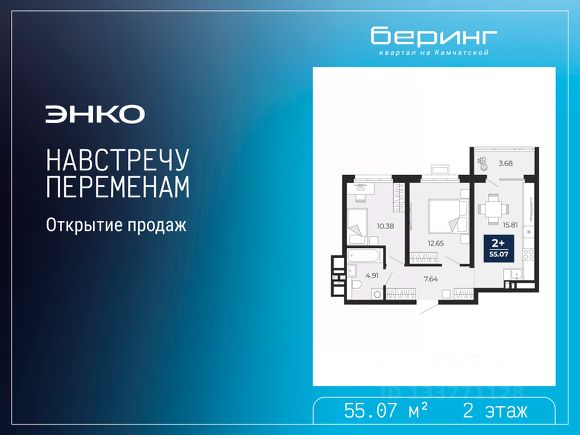 Квартира с кухней-гостиной и двумя спальнями в кварталах "На Минской". Особенности планировки: балкон, вид во двор, гардеробная, мастер-спальня, предчистовая отделка, разнесённые спальни.