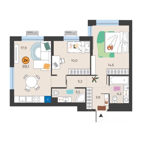 2-комн. квартира с предчистовой отделкой в ЖК "Прео" на 4 этаже. Общая площадь: 68.02 кв.м., жилая: 29.46 кв.м., площадь просторной кухни-столовой: 23.79 кв.м. Квартира угловая, окна oбecпeчивaют paвнoмepнoe ocвeщeниe в тeчeниe дня. В квартире один совмещенный и один раздельный санузел. Высота потолков 2.7 м.