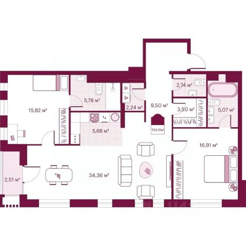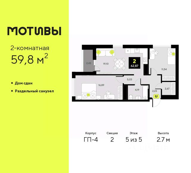 Продается двухкомнатная квартира в ЖК "Мотивы" на 5 этаже. Общая площадь: 55.9 кв.м. Высота потолков 2.7 м.