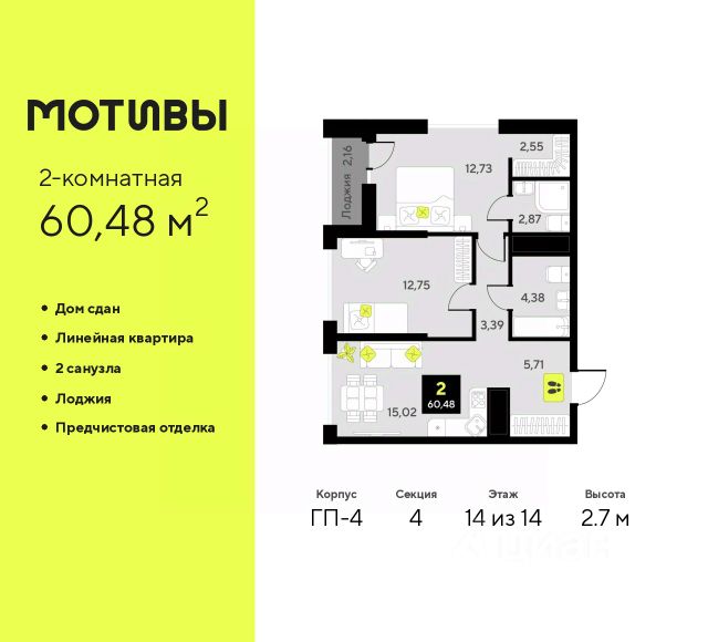 Продаётся квартира площадью 60.50 м2 в жилом комплексе "Айрис". Квартира находится на 2 этаже дома, который будет введен в эксплуатацию в 3 квартале 2027 года. Жилая площадь квартиры 16.50 м2, площадь просторной кухни — 16.70 м2. Среди особенностей планировки — изолированные комнаты с окнами на одну сторону, 1 совмещённый санузел. Жилой комплекс "Айрис" — это: фиджитал-квартал в Тюмени дома высотой от 7 до 25 этажей квартиры с системой "Умный дом" цифровые технологии как элемент благоустройства Срок сдачи — III кв. 2027 Окружение В нескольких минутах ходьбы от дома — парк "Комарово" с волейбольной площадкой, открытым кинотеатром, зонами для барбекю и катком. Неподалеку от Airis находится центр иппотерапии, где можно покататься на лошадях и взять уроки верховой езды. На территории Airis появится собственный парк с прогулочными аллеями. Инфраструктура В 5-10 минутах от квартала открыты 2 детских сада и гимназия. На шопинг можно отправиться в торговые комплексы "Колумб" и "Кристалл" — они находятся недалеко от дома. Благоустройство Уютный двор — приватное пространство для жителей. В беседках можно будет почитать книгу в тишине, а в тени деревьев устроиться на пикник. На крыше многоуровневого паркинга будет лаунж-зона с кинотеатром, баскетбольная площадка и воркаут-пространство, где можно позаниматься с виртуальным тренером — достаточно отсканировать код. Лобби Интерьеры лобби выполнены в пастельных тонах с элементами фиджитал-решений. Для отдыха и ожидания гостей создана лаунж-зона. Также есть гостевые санузлы. Колясочные Возвращайтесь налегке после прогулки с малышом — оставить коляску можно в специальном помещении на первом этаже. Кладовые Для сезонных и габаритных вещей предусмотрены отдельные кладовые на цокольном этаже. В каждом помещении уже проведено электричество и выполнена стяжка пола. Паркинг На территории — два многоуровневых наземных паркинга. Один из них примыкает к домам — из него можно напрямую пройти в парадные. Планировки Планировки квартала — от компактной студии до сити-хауса с собственным палисадником — соответствуют любым жизненным сценариям. Можно выбрать квартиры с террасами и готовыми дизайнерскими интерьерами.