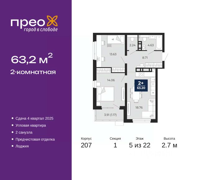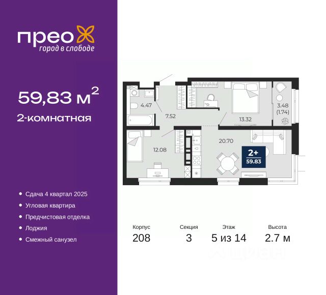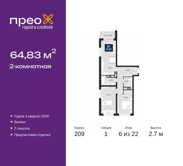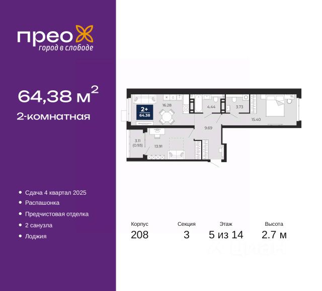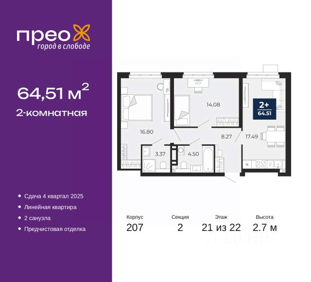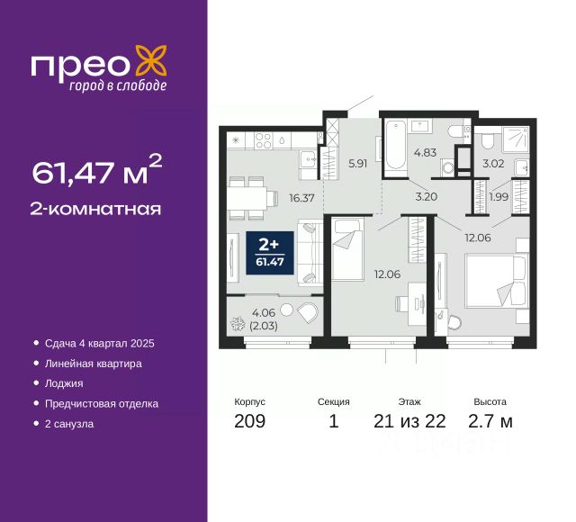 Просторная 2-комн. квартира с предчистовой отделкой в ЖК "Прео" на 16 этаже. Общая площадь: 56.08 кв.м., жилая: 22.33 кв.м., площадь просторной кухни-столовой: 16.04 кв.м. Комнаты изолированные, все окна выходят на одну сторону. В квартире один раздельный санузел. Высота потолков 2.7 м. Дом монолитный, черырехподъездный, переменной этажности, от 14 до 21 этажей. Квартира находится во 2-й секции высотой 21 этаж в корпусе 211. На этаже 10 квартир. В подъезде 1 пассажирский и 1 грузовой лифт. Окончание строительства - 4 квартал 2026 года. Оформление сделки по договору долевого участия. Преображенский — один из самых привлекательных районов для жизни! Это полностью самостоятельный жилой район с точки зрения инфраструктуры. Преображенский находится между Московским и Червишевским трактами в квартале улиц Закалужская — Вьюжная — Александра Протозанова. Не нужно ждать, когда появится инфраструктура — переезжайте на всё готовое. Вблизи расположены действующие школа и детский сад. В этом году откроется еще один сад, а в следующем году — школа. По соседству с Преображенским запланировано строительство городского парка "Комарово" площадью 38 гектар. За 10 минут можно доехать на автомобиле до крупных ТРЦ: "Лента", "Кристалл", "Леруа Мерлен", "Метро" и "Ашан". С 2018 года в районе открыт Соседский центр — пространство, созданное для формирования добрососедской среды, совместного досуга, общения и реализации соседских инициатив. Здесь проходят встречи соседей, а также сами жители района организовывают мероприятия. Организатором такого события может стать любой желающий. В квартирах выполнена качественная предчистовая отделка. Гладкие стены с финишным выравниванием по маякам. Ровный потолок для установки натяжного потолка. Установлены пятикамерные окна с двойным стеклопакетом (3 стекла). Дизайнерские холлы с видеонаблюдением, безбарьерным и прозрачным входом всегда светло и спокойно. На первом этаже есть просторные колясочные, где все жители могут оставлять свои коляски и велосипеды. В Преображенском есть всё, что нужно для активного отдыха и занятий спортом. Мы сделали большое футбольное поле с безопасным покрытием. Также установили хоккейный корт, который оборудован по всем необходимым стандартам. Во дворах можно делать упражнения на специальных площадках с турниками. Весь район мы обустроили велодорожками, которые связаны в единый маршрут. У нас есть сухие фонтаны, бьющие из земли, деревья, веревки, сетки, скалодром, газон, песок и резинка — осталось просто дать своему ребенку право на свободную игру. По-настоящему хорошие дворы — это те, которые дети предпочитают соцсетям и телевизору. Аккредитация в банках: ПАО "Газпромбанк", ОАО "Альфа-Банк", ПАО "Банк Уралсиб", ПАО Банк "ВТБ", "Сбербанк России" и других. #2s0acB