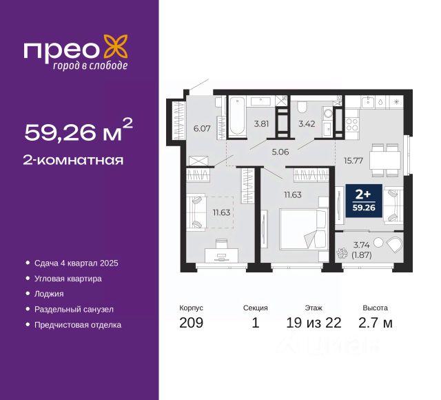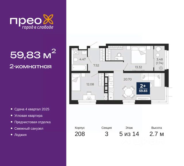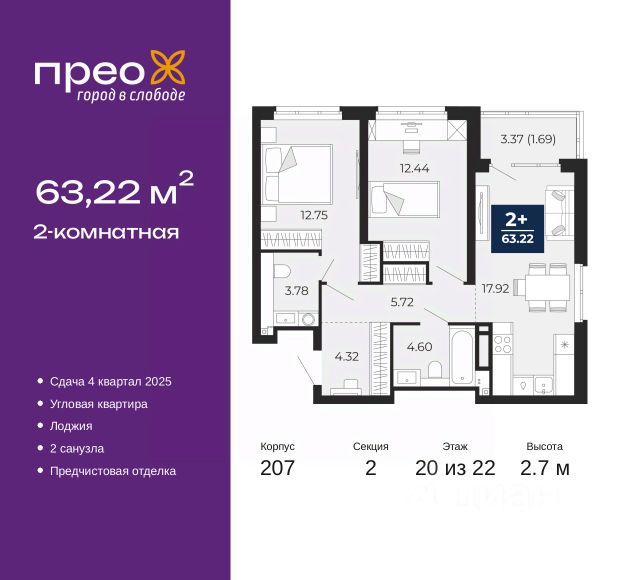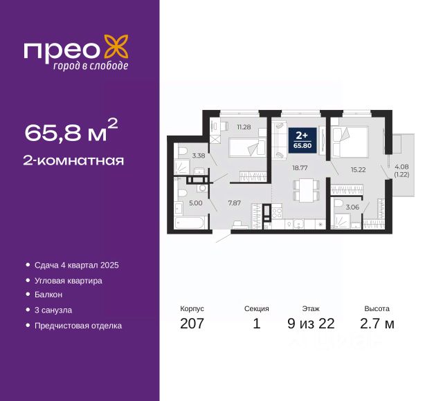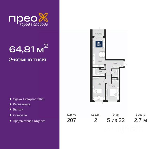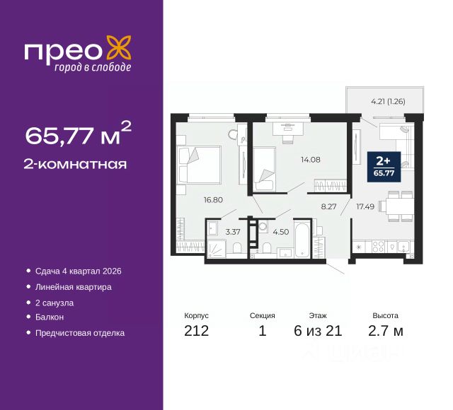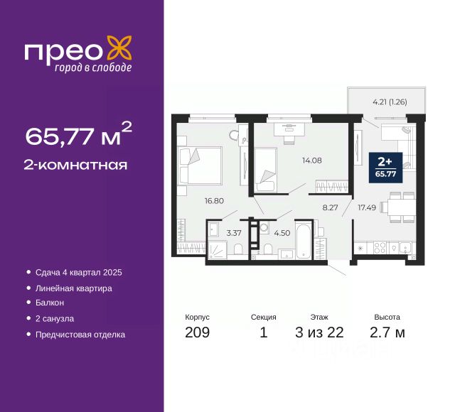 2-комн. квартира с предчистовой отделкой в ЖК "Прео" на 2 этаже. Общая площадь: 65.81 кв.м., жилая: 28.32 кв.м., площадь просторной кухни-столовой: 19.06 кв.м. Квартира - распашонка, без проходных комнат, окна выходят на paзные стороны дома. В квартире один балкон, один раздельный санузел. Высота потолков 2.7 м. Дом монолитный, черырехподъездный, переменной этажности, от 14 до 21 этажей. Квартира находится во 2-й секции высотой 21 этаж в корпусе 211. На этаже 10 квартир. В подъезде 1 пассажирский и 1 грузовой лифт. Окончание строительства - 4 квартал 2026 года. Оформление сделки по договору долевого участия. Преображенский — один из самых привлекательных районов для жизни! Это полностью самостоятельный жилой район с точки зрения инфраструктуры. Преображенский находится между Московским и Червишевским трактами в квартале улиц Закалужская — Вьюжная — Александра Протозанова. Не нужно ждать, когда появится инфраструктура — переезжайте на всё готовое. Вблизи расположены действующие школа и детский сад. В этом году откроется еще один сад, а в следующем году — школа. По соседству с Преображенским запланировано строительство городского парка "Комарово" площадью 38 гектар. За 10 минут можно доехать на автомобиле до крупных ТРЦ: "Лента", "Кристалл", "Леруа Мерлен", "Метро" и "Ашан". С 2018 года в районе открыт Соседский центр — пространство, созданное для формирования добрососедской среды, совместного досуга, общения и реализации соседских инициатив. Здесь проходят встречи соседей, а также сами жители района организовывают мероприятия. Организатором такого события может стать любой желающий. В квартирах выполнена качественная предчистовая отделка. Гладкие стены с финишным выравниванием по маякам. Ровный потолок для установки натяжного потолка. Установлены пятикамерные окна с двойным стеклопакетом (3 стекла). Дизайнерские холлы с видеонаблюдением, безбарьерным и прозрачным входом всегда светло и спокойно. На первом этаже есть просторные колясочные, где все жители могут оставлять свои коляски и велосипеды. В Преображенском есть всё, что нужно для активного отдыха и занятий спортом. Мы сделали большое футбольное поле с безопасным покрытием. Также установили хоккейный корт, который оборудован по всем необходимым стандартам. Во дворах можно делать упражнения на специальных площадках с турниками. Весь район мы обустроили велодорожками, которые связаны в единый маршрут. У нас есть сухие фонтаны, бьющие из земли, деревья, веревки, сетки, скалодром, газон, песок и резинка — осталось просто дать своему ребенку право на свободную игру. По-настоящему хорошие дворы — это те, которые дети предпочитают соцсетям и телевизору. Аккредитация в банках: ПАО Банк "ВТБ", "Сбербанк России", ОАО "Альфа-Банк", ПАО "Газпромбанк", ПАО "Банк Уралсиб" и других. #zS0B27