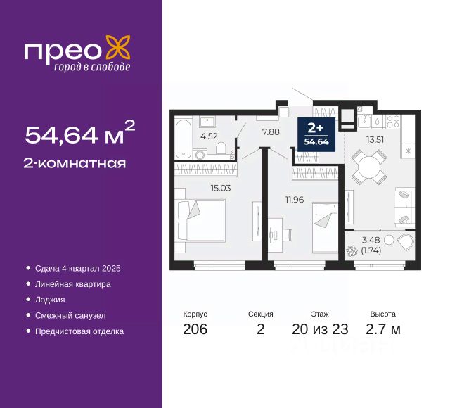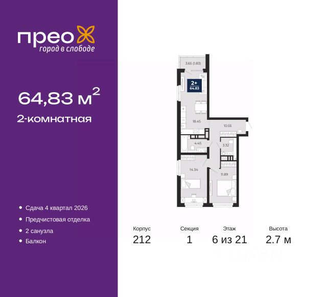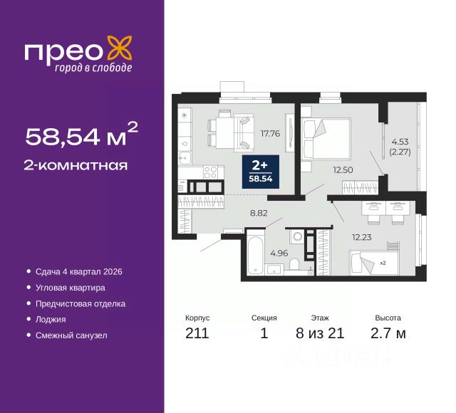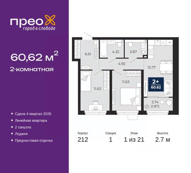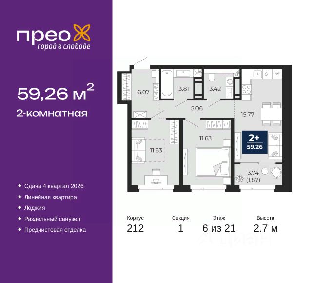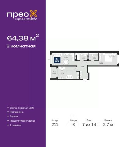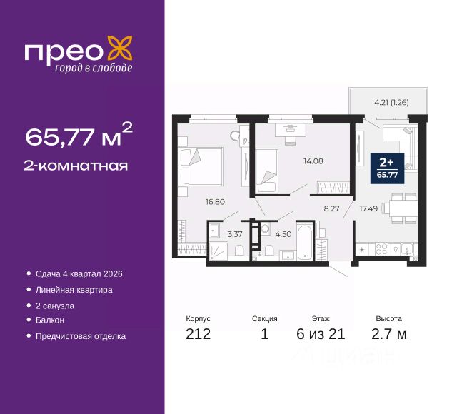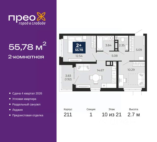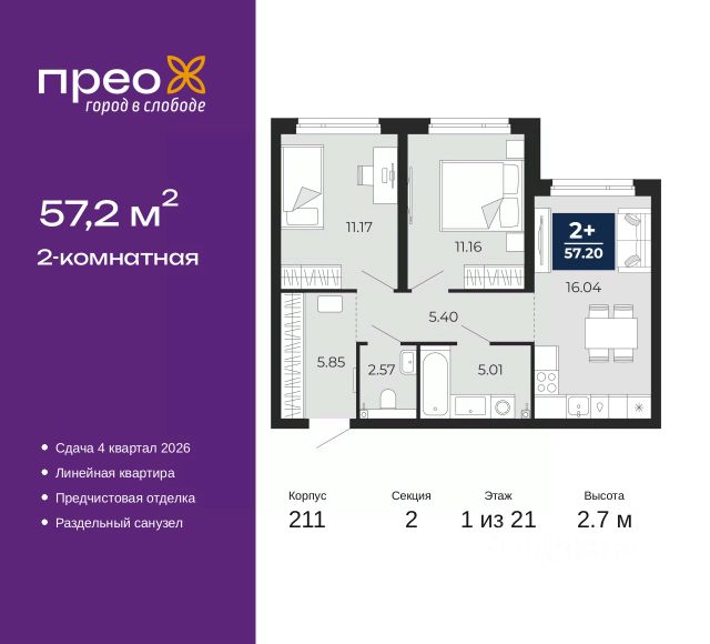 2-комн. квартира с предчистовой отделкой в ЖК "Прео" на 20 этаже. Общая площадь: 54.64 кв.м., жилая: 26.99 кв.м., площадь просторной кухни-столовой: 13.51 кв.м. Комнаты изолированные, все окна выходят на одну сторону. В квартире одна лоджия, один совмещенный санузел. Высота потолков 2.7 м. Дом монолитный, черырехподъездный, переменной этажности, от 14 до 21 этажей. Квартира находится во 2-й секции высотой 21 этаж в корпусе 211. На этаже 10 квартир. В подъезде 1 пассажирский и 1 грузовой лифт. Окончание строительства - 4 квартал 2026 года. Оформление сделки по договору долевого участия. Преображенский — один из самых привлекательных районов для жизни! Это полностью самостоятельный жилой район с точки зрения инфраструктуры. Преображенский находится между Московским и Червишевским трактами в квартале улиц Закалужская — Вьюжная — Александра Протозанова. Не нужно ждать, когда появится инфраструктура — переезжайте на всё готовое. Вблизи расположены действующие школа и детский сад. В этом году откроется еще один сад, а в следующем году — школа. По соседству с Преображенским запланировано строительство городского парка "Комарово" площадью 38 гектар. За 10 минут можно доехать на автомобиле до крупных ТРЦ: "Лента", "Кристалл", "Леруа Мерлен", "Метро" и "Ашан". С 2018 года в районе открыт Соседский центр — пространство, созданное для формирования добрососедской среды, совместного досуга, общения и реализации соседских инициатив. Здесь проходят встречи соседей, а также сами жители района организовывают мероприятия. Организатором такого события может стать любой желающий. В квартирах выполнена качественная предчистовая отделка. Гладкие стены с финишным выравниванием по маякам. Ровный потолок для установки натяжного потолка. Установлены пятикамерные окна с двойным стеклопакетом (3 стекла). Дизайнерские холлы с видеонаблюдением, безбарьерным и прозрачным входом всегда светло и спокойно. На первом этаже есть просторные колясочные, где все жители могут оставлять свои коляски и велосипеды. В Преображенском есть всё, что нужно для активного отдыха и занятий спортом. Мы сделали большое футбольное поле с безопасным покрытием. Также установили хоккейный корт, который оборудован по всем необходимым стандартам. Во дворах можно делать упражнения на специальных площадках с турниками. Весь район мы обустроили велодорожками, которые связаны в единый маршрут. У нас есть сухие фонтаны, бьющие из земли, деревья, веревки, сетки, скалодром, газон, песок и резинка — осталось просто дать своему ребенку право на свободную игру. По-настоящему хорошие дворы — это те, которые дети предпочитают соцсетям и телевизору. Аккредитация в банках: "Сбербанк России", ПАО Банк "ВТБ", ОАО "Альфа-Банк", ПАО "Газпромбанк", ПАО "Банк Уралсиб" и других. #z50acA