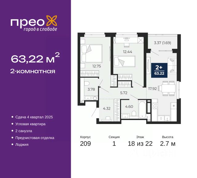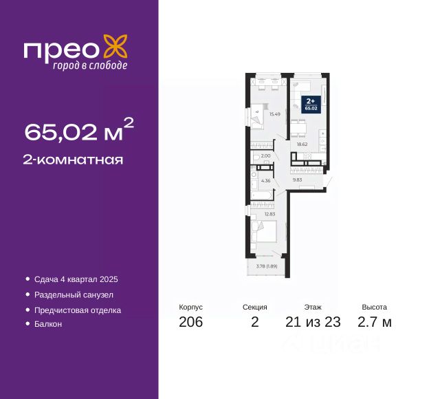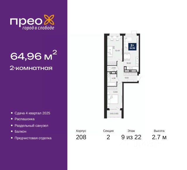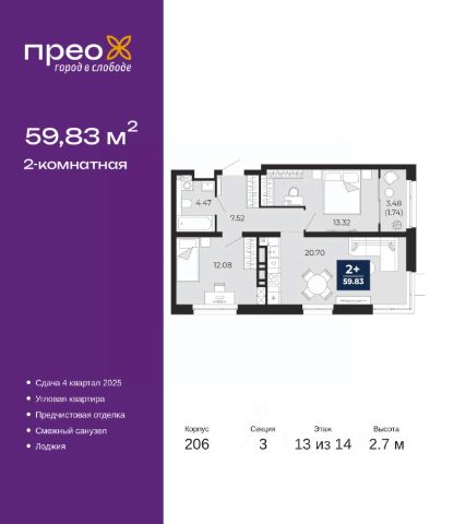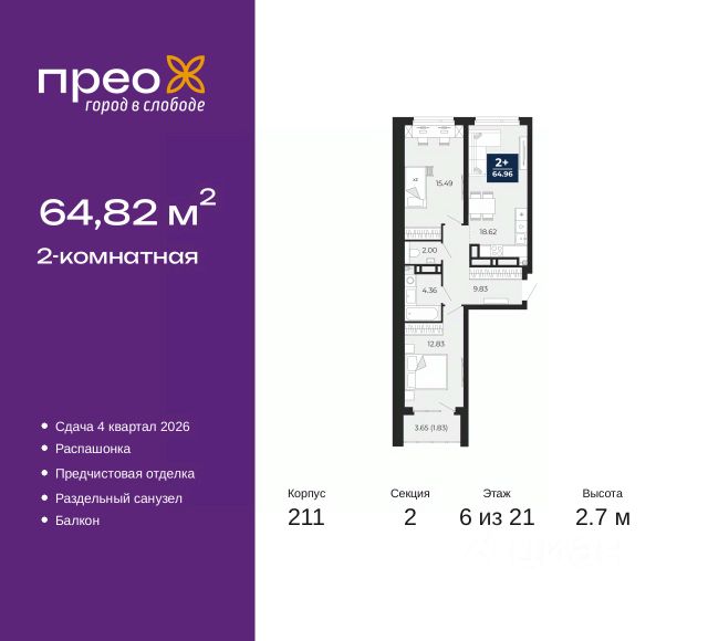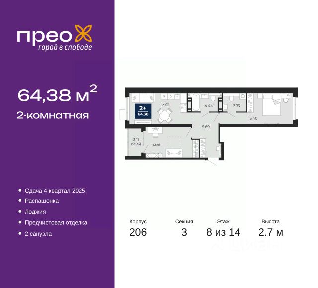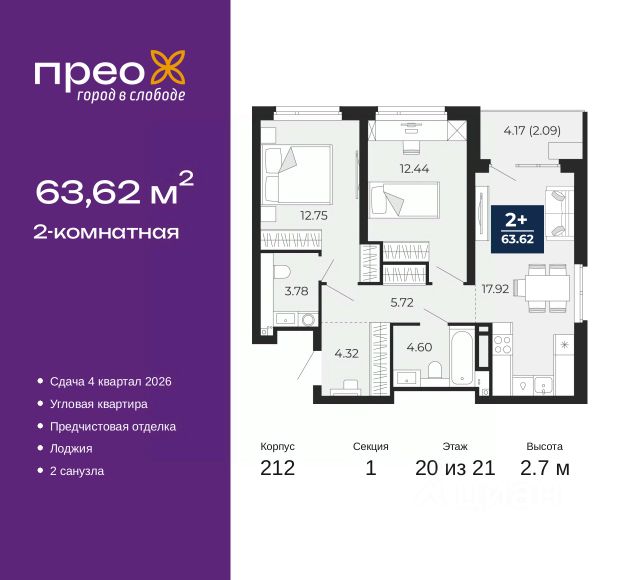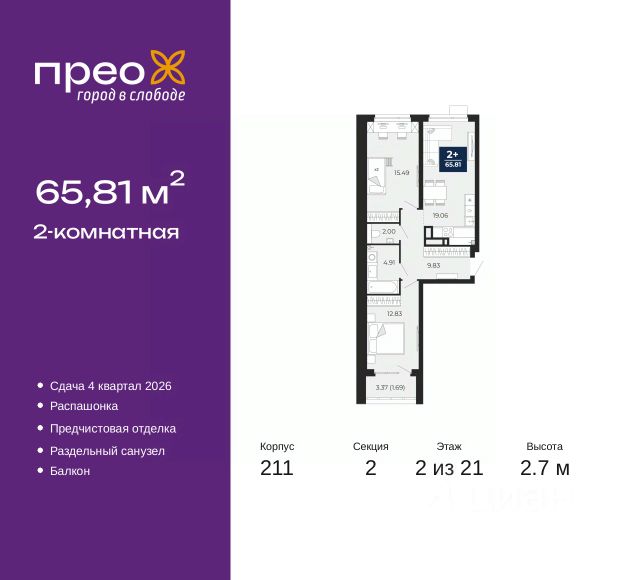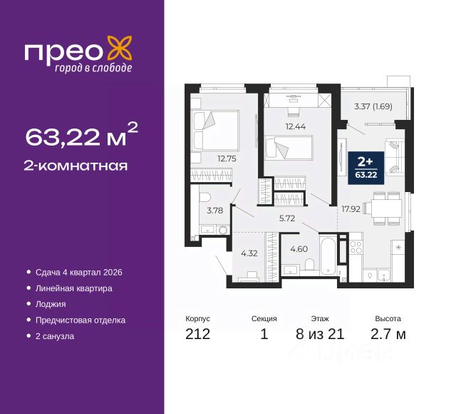2-комн. квартира с предчистовой отделкой в ЖК "Прео" на 20 этаже. Общая площадь: 54.64 кв.м., жилая: 26.99 кв.м., площадь просторной кухни-столовой: 13.51 кв.м. Комнаты изолированные, все окна выходят на одну сторону. В квартире одна лоджия, один совмещенный санузел. Высота потолков 2.7 м. Дом монолитный, черырехподъездный, переменной этажности, от 14 до 21 этажей. Квартира находится во 2-й секции высотой 21 этаж в корпусе 211. На этаже 10 квартир. В подъезде 1 пассажирский и 1 грузовой лифт. Окончание строительства - 4 квартал 2026 года. Оформление сделки по договору долевого участия. Преображенский — один из самых привлекательных районов для жизни! Это полностью самостоятельный жилой район с точки зрения инфраструктуры. Преображенский находится между Московским и Червишевским трактами в квартале улиц Закалужская — Вьюжная — Александра Протозанова. Не нужно ждать, когда появится инфраструктура — переезжайте на всё готовое. Вблизи расположены действующие школа и детский сад. В этом году откроется еще один сад, а в следующем году — школа. По соседству с Преображенским запланировано строительство городского парка "Комарово" площадью 38 гектар. За 10 минут можно доехать на автомобиле до крупных ТРЦ: "Лента", "Кристалл", "Леруа Мерлен", "Метро" и "Ашан". С 2018 года в районе открыт Соседский центр — пространство, созданное для формирования добрососедской среды, совместного досуга, общения и реализации соседских инициатив. Здесь проходят встречи соседей, а также сами жители района организовывают мероприятия. Организатором такого события может стать любой желающий. В квартирах выполнена качественная предчистовая отделка. Гладкие стены с финишным выравниванием по маякам. Ровный потолок для установки натяжного потолка. Установлены пятикамерные окна с двойным стеклопакетом (3 стекла). Дизайнерские холлы с видеонаблюдением, безбарьерным и прозрачным входом всегда светло и спокойно. На первом этаже есть просторные колясочные, где все жители могут оставлять свои коляски и велосипеды. В Преображенском есть всё, что нужно для активного отдыха и занятий спортом. Мы сделали большое футбольное поле с безопасным покрытием. Также установили хоккейный корт, который оборудован по всем необходимым стандартам. Во дворах можно делать упражнения на специальных площадках с турниками. Весь район мы обустроили велодорожками, которые связаны в единый маршрут. У нас есть сухие фонтаны, бьющие из земли, деревья, веревки, сетки, скалодром, газон, песок и резинка — осталось просто дать своему ребенку право на свободную игру. По-настоящему хорошие дворы — это те, которые дети предпочитают соцсетям и телевизору. Аккредитация в банках: "Сбербанк России", ПАО Банк "ВТБ", ОАО "Альфа-Банк", ПАО "Газпромбанк", ПАО "Банк Уралсиб" и других. #z50acA