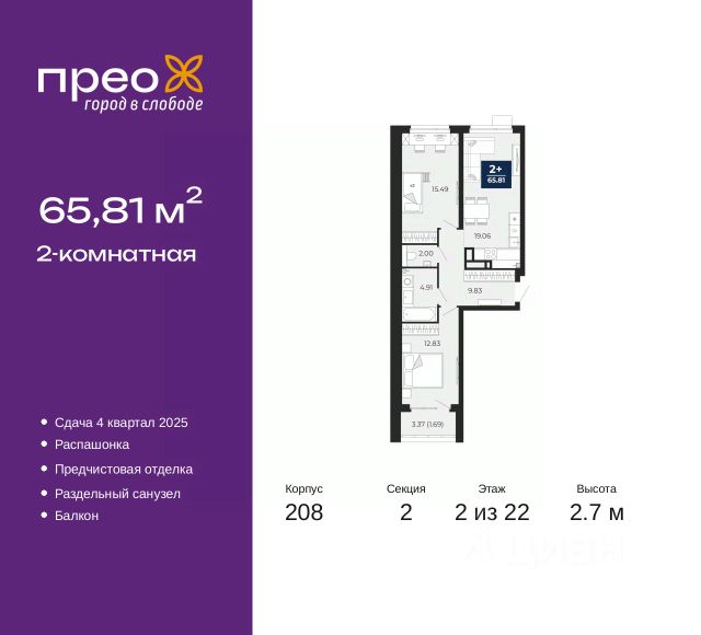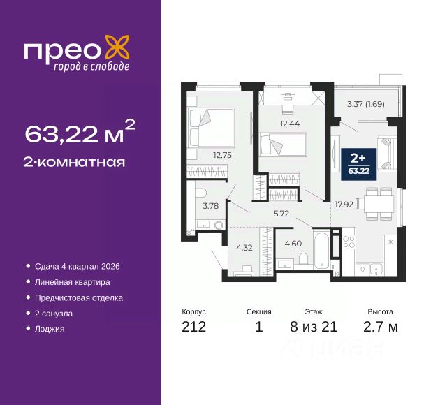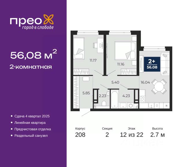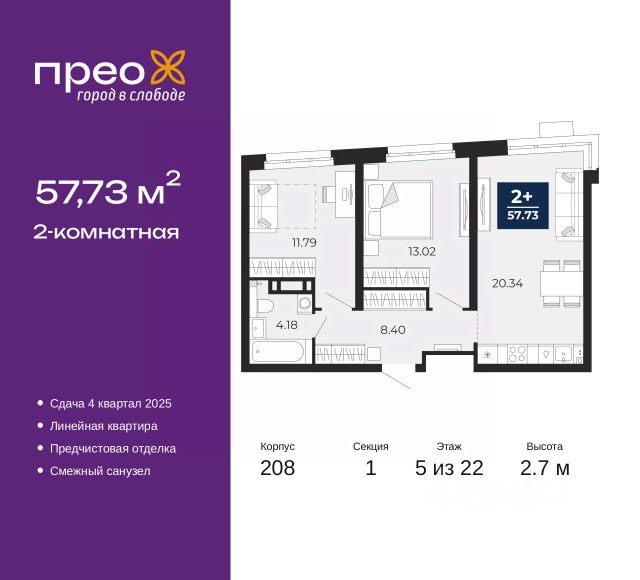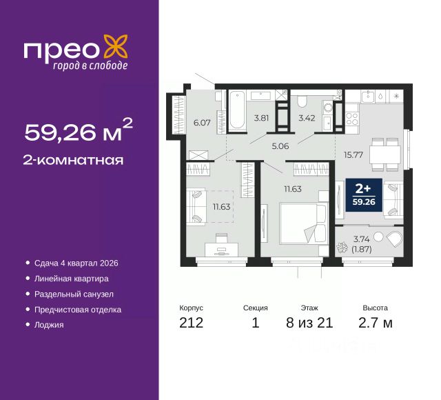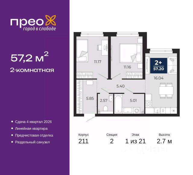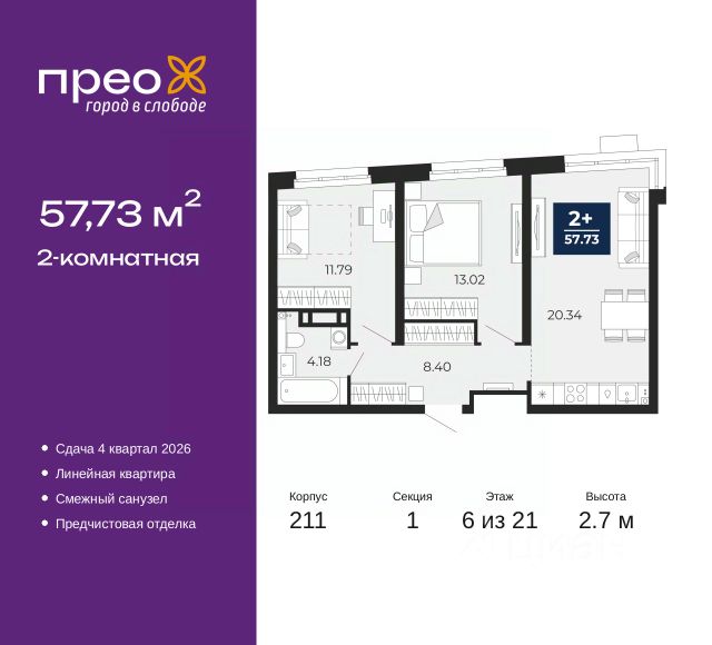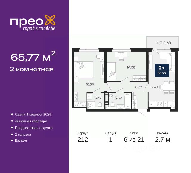 Двухкомнатная квартира с предчистовой отделкой в ЖК "Прео" на 20 этаже. Общая площадь: 54.64 кв.м., жилая: 26.99 кв.м., площадь просторной кухни-столовой: 13.51 кв.м. Комнаты изолированные, все окна выходят на одну сторону. В квартире одна лоджия, один совмещенный санузел. Высота потолков 2.7 м. Дом монолитный, черырехподъездный, переменной этажности, от 14 до 21 этажей. Квартира находится во 2-й секции высотой 21 этаж в корпусе 211. На этаже 10 квартир. В подъезде 1 пассажирский и 1 грузовой лифт. Окончание строительства - 4 квартал 2026 года. Оформление сделки по договору долевого участия. Преображенский — один из самых привлекательных районов для жизни! Это полностью самостоятельный жилой район с точки зрения инфраструктуры. Преображенский находится между Московским и Червишевским трактами в квартале улиц Закалужская — Вьюжная — Александра Протозанова. Не нужно ждать, когда появится инфраструктура — переезжайте на всё готовое. Вблизи расположены действующие школа и детский сад. В этом году откроется еще один сад, а в следующем году — школа. По соседству с Преображенским запланировано строительство городского парка "Комарово" площадью 38 гектар. За 10 минут можно доехать на автомобиле до крупных ТРЦ: "Лента", "Кристалл", "Леруа Мерлен", "Метро" и "Ашан". С 2018 года в районе открыт Соседский центр — пространство, созданное для формирования добрососедской среды, совместного досуга, общения и реализации соседских инициатив. Здесь проходят встречи соседей, а также сами жители района организовывают мероприятия. Организатором такого события может стать любой желающий. В квартирах выполнена качественная предчистовая отделка. Гладкие стены с финишным выравниванием по маякам. Ровный потолок для установки натяжного потолка. Установлены пятикамерные окна с двойным стеклопакетом (3 стекла). Дизайнерские холлы с видеонаблюдением, безбарьерным и прозрачным входом всегда светло и спокойно. На первом этаже есть просторные колясочные, где все жители могут оставлять свои коляски и велосипеды. В Преображенском есть всё, что нужно для активного отдыха и занятий спортом. Мы сделали большое футбольное поле с безопасным покрытием. Также установили хоккейный корт, который оборудован по всем необходимым стандартам. Во дворах можно делать упражнения на специальных площадках с турниками. Весь район мы обустроили велодорожками, которые связаны в единый маршрут. У нас есть сухие фонтаны, бьющие из земли, деревья, веревки, сетки, скалодром, газон, песок и резинка — осталось просто дать своему ребенку право на свободную игру. По-настоящему хорошие дворы — это те, которые дети предпочитают соцсетям и телевизору. Аккредитация в банках: ПАО "Банк Уралсиб", ОАО "Альфа-Банк", ПАО Банк "ВТБ", "Сбербанк России", ПАО "Газпромбанк" и других. #ZsoaCA