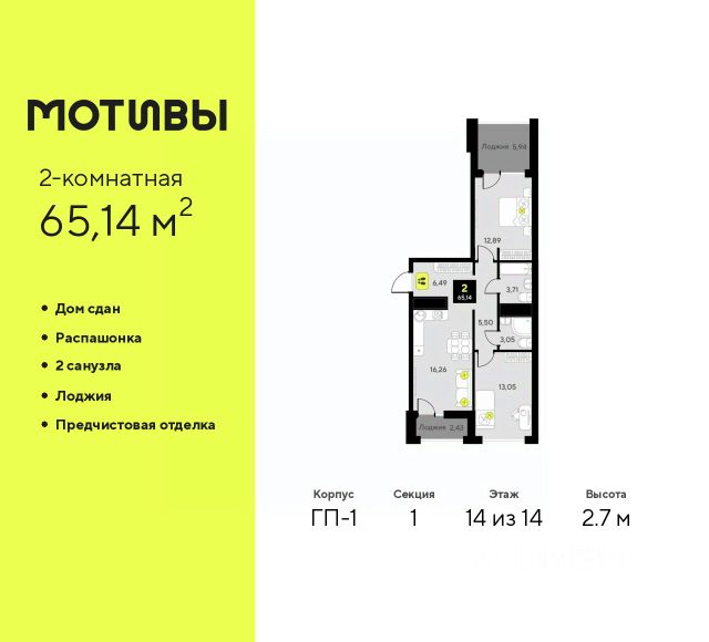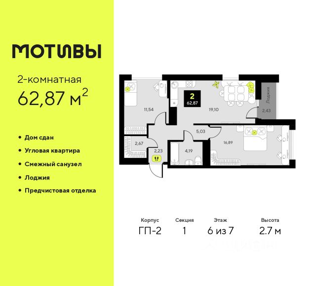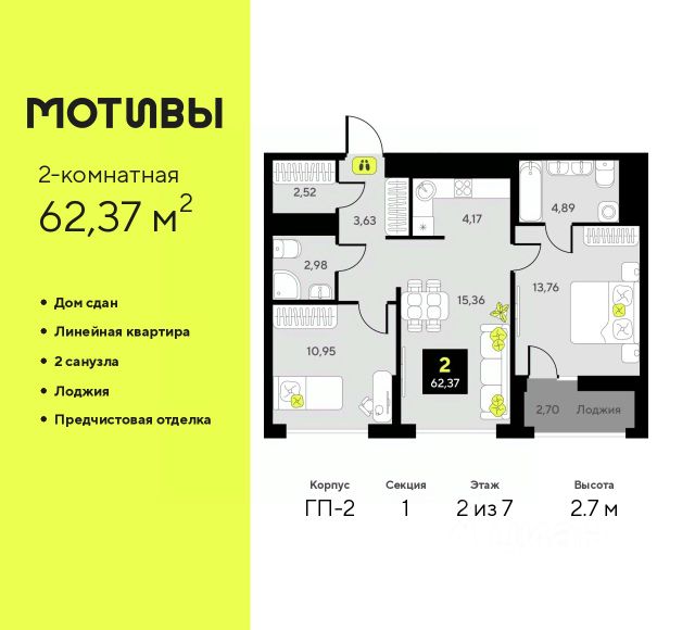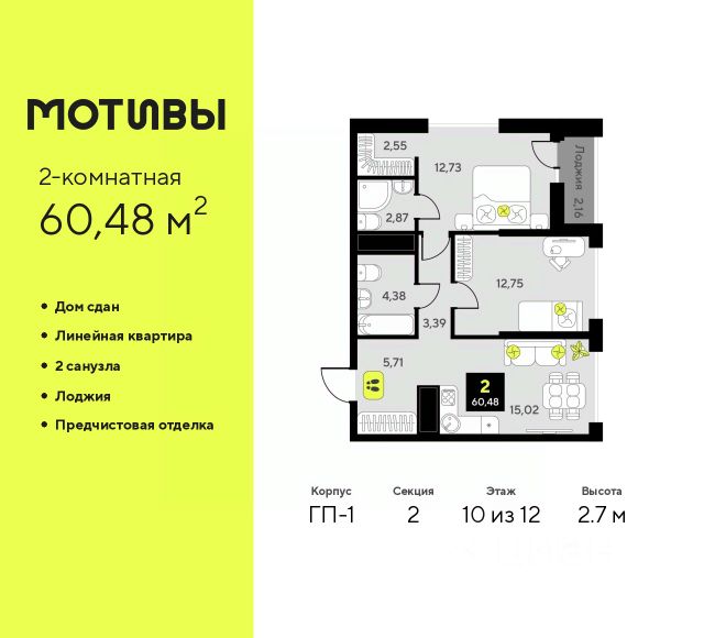 2-комн. квартира с предчистовой отделкой в ЖК "Мотивы" на 5 этаже. Общая площадь: 60.45 кв.м., жилая: 26.55 кв.м., площадь просторной кухни-столовой: 16.12 кв.м. Угловая квартира, идеально подойдет любителям тишины и панорамных видов. В квартире две лоджии, один совмещенный санузел. Наличие в квартире террасы дает возможность для создания зон отдыха в кругу семьи и друзей. Высота потолков 2.7 м. Квартира будет сдаваться с предчистовой отделкой White Box: выровнены и оштукатурены стены, проведено электричество и отопление, установлены радиаторы. Вы также можете приобрести квартиру с ремонтом от застройщика, представленным в трех цветовых решениях Scandi, Wood и Coffee и включающим ламинат, обои под покраску, двери, натяжной потолок и санузел с сантехникой. При желании вы можете заказать отделку под ключ, варианты возможных решений представлены в альбоме фотографий. Квартира находится в корпусе ГП-2. Дом монолитный, одноподъездный, высотой 7 этажей. На этаже 5 квартир. В подъезде 1 пассажирский и 1 грузовой лифт. В настоящее время строительство окончено, дом сдан в 4 квартале 2024 года. Оформление сделки по договору купли-продажи. Закрытая от автомобилей территория, безопасный двор и камеры видеонаблюдения - гаранты вашего спокойствия. Квартал будет располагать богатой инфраструктурой: на первых этажах разместятся магазины, пекарни, кофейни, пункты выдачи, аптеки, детские центры, цветочные салоны и многое другое, что сделает жизнь поистине комфортной. Рядом находится парк общей площадью почти 5000 м², в котором располагаются локации для игр и отдыха жителей, здесь можно совершить утреннюю пробежку или прогуляться после рабочего дня. В парке есть зона воркаута с тренажерами для взрослых, игровые комплексы с горками и канатный комплекс для детей разных возрастов, качели и лавочки для отдыха, площадки для командных видов спорта и для панна-футбола. В ЖК "Мотивы" всё продумано до мелочей: светлые холлы входных групп, оформленные в едином стиле, просторные колясочные, лапомойки для питомцев. На территории комплекса находятся 2 8-ми этажных паркинга и более 1000 м/м на открытой парковке. Жилой комплекс находится в одном из экологически благоприятных районов Тюмени, недалеко от Плехановского бора. При этом до центра города можно добраться за 15 минут, а до международного аэропорта Рощино за 13 минут. Окончание строительства: ГП 1, 2, 3, 4 сдача до конца 2024 года, ГП 6, 7, 8 сдача 2 квартал 2026 года. #zSOwMU