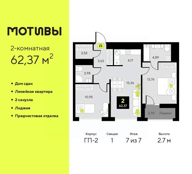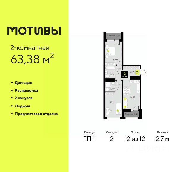 Продается двухкомнатная квартира от застройщика с предчистовой отделкой в ЖК "Мотивы" на 5 этаже. Общая площадь: 60.48 кв.м., жилая: 25.48 кв.м., площадь просторной кухни-столовой: 15.02 кв.м. Комнаты изолированные, все окна выходят на одну сторону. В квартире одна лоджия, два совмещенных санузла. Высота потолков 2.7 м. Квартира будет сдаваться с предчистовой отделкой White Box: выровнены и оштукатурены стены, проведено электричество и отопление, установлены радиаторы. Вы также можете приобрести квартиру с ремонтом от застройщика, представленным в трех цветовых решениях Scandi, Wood и Coffee и включающим ламинат, обои под покраску, двери, натяжной потолок и санузел с сантехникой. При желании вы можете заказать отделку под ключ, варианты возможных решений представлены в альбоме фотографий. Дом монолитный, двухподъездный, переменной этажности, от 12 до 14 этажей. Квартира находится в 1-й секции высотой 14 этажей в корпусе ГП-1. На этаже 12 квартир. В подъезде 1 пассажирский и 1 грузовой лифт. В настоящее время строительство окончено, дом сдан в 4 квартале 2024 года. Оформление сделки по договору купли-продажи. Закрытая от автомобилей территория, безопасный двор и камеры видеонаблюдения - гаранты вашего спокойствия. Квартал будет располагать богатой инфраструктурой: на первых этажах разместятся магазины, пекарни, кофейни, пункты выдачи, аптеки, детские центры, цветочные салоны и многое другое, что сделает жизнь поистине комфортной. Рядом находится парк общей площадью почти 5000 м², в котором располагаются локации для игр и отдыха жителей, здесь можно совершить утреннюю пробежку или прогуляться после рабочего дня. В парке есть зона воркаута с тренажерами для взрослых, игровые комплексы с горками и канатный комплекс для детей разных возрастов, качели и лавочки для отдыха, площадки для командных видов спорта и для панна-футбола. В ЖК "Мотивы" всё продумано до мелочей: светлые холлы входных групп, оформленные в едином стиле, просторные колясочные, лапомойки для питомцев. На территории комплекса находятся 2 8-ми этажных паркинга и более 1000 м/м на открытой парковке. Жилой комплекс находится в одном из экологически благоприятных районов Тюмени, недалеко от Плехановского бора. При этом до центра города можно добраться за 15 минут, а до международного аэропорта Рощино за 13 минут. Окончание строительства: ГП 1, 2, 3, 4 сдача до конца 2024 года, ГП 6, 7, 8 сдача 2 квартал 2026 года. #zWAgdE