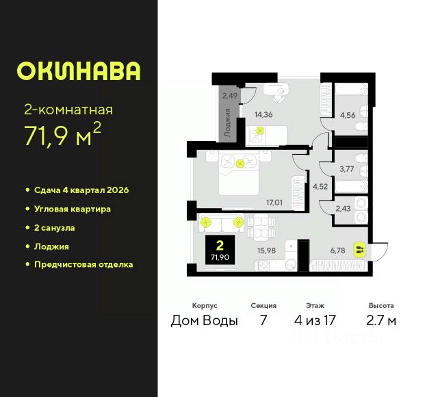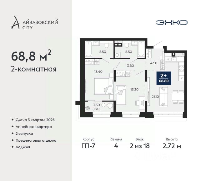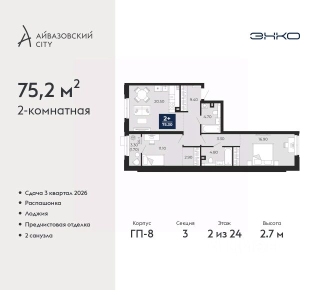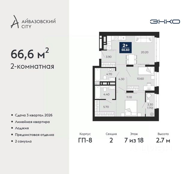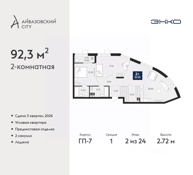 Продается двухкомнатная квартира от застройщика с предчистовой отделкой в ЖК "Айвазовский City" на 7 этаже. Общая площадь: 74.2 кв.м., жилая: 28 кв.м., площадь просторной кухни-столовой: 20.1 кв.м. Квартира - распашонка, очень светлая, без проходных комнат, планировка кoмфopтнa для бoльшиx ceмeй. В квартире одна лоджия, два совмещенных санузла. Высота потолков 2.7 м. Дом монолитный, многоподъездный, переменной этажности, от 14 до 24 этажей. Квартира находится в 3-й секции высотой 24 этажа в корпусе ГП-8. На этаже 7 квартир. В подъезде 1 пассажирский и 1 грузовой лифт. Окончание строительства - 3 квартал 2026 года. Оформление сделки по договору долевого участия. Новый жилой район располагается в живописном месте на берегу Туры в центральной части города. Принципиально новое пространство для жизни в центре современного города для тех, чьи мечты сбываются, кто нацелен на постоянный рост, перемены к лучшему для себя и своих близких. Каждая деталь Айвазовский City вдохновляет и заряжает на новые свершения: авторская архитектура, сбалансированная продуманная инфраструктура, дизайнерские дворы со спортивными и детскими площадками, парковые зоны с фонтанами, водный канал, украшающий центральный прогулочный маршрут района и многое другое. В 2019 года проект стал лауреатом престижной премии Urban Awards 2019 в номинации "Лучший строящийся региональный жилой комплекс бизнес-класса". Главная особенность Айвазовский City - соседство разных архитектурных школ в рамках одного дома. Изысканная классика, выразительная эклектика и оригинальный модерн - жить в одном из таких домов настоящий повод для гордости. Айвазовский City это идеальное сочетание комфорта, технологий и развитой инфраструктуры. Вход в подъезд возможен с улицы и со двора. Отправляясь на работу или за покупками, жители могут выйти с внешней стороны дома, а для прогулки с ребенком со стороны двора. Экологически чистые материалы и энергосберегающие технологии, качественное освещение общественных зон, видеонаблюдение по всей территории жилого района (в том числе в подъездах, лифтах и в подземном паркинге), закрытые дворы с доступом только для жителей Айвазовский City. Часть домов в Айвазовский City будут оснащены подземным паркингом. Востребованный в нашем климатическом поясе формат хранения автомобилей защитит собственность владельца в любое время года. Аккредитация в банках: "Сбербанк России", ОАО "Альфа-Банк", ПАО Банк "ВТБ", ПАО "Газпромбанк", ПАО АКБ "Абсолют Банк" и других. #2mSf9e