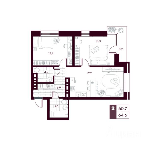 Продаётся квартира площадью 58.05 м2 в жилом комплексе "Дабл-Дабл". Квартира находится на 4 этаже, жилая площадь квартиры 26.28 м2, площадь просторной кухни — 10.27 м2. Среди особенностей планировки — изолированные комнаты с окнами на одну сторону, 1 совмещённый санузел. Срок сдачи — II кв. 2028 Жилой комплекс "Дабл-Дабл" — это: - проект комфорт-класса на Московском тракте - дома высотой 15 этажей - квартиры от 1-комнатных до 2-уровневых Окружение На границе жилого комплекса — живописный лес. Достаточно открыть окна, чтобы впустить в комнаты ароматы зелени, прохладу и чистый воздух. Благоустройство Юные жители оценят игровые площадки и воркаут-зоны. Любителям неспешных прогулок понравится 2-уровневый променад с панорамным видом и навесами. Лобби Помещения встречают дизайнерскими интерьерами с уютными лаунж-зонами, где удобно подождать курьера или просто сделать паузу перед возвращением домой. Колясочные Возвращайтесь налегке после прогулки с малышом — оставить коляску можно в специальном помещении на первом этаже. Кладовые Благодаря индивидуальным помещениям на техническом этаже сезонные и габаритные вещи будут на своём месте. 2-уровневые квартиры Просторная гостиная и кухня располагаются на первом этаже, спальня и кабинет — на втором. Почувствуйте, как жизнь выходит на новый уровень комфорта и приватности. Панорамное остекление Окна в пол наполняют комнаты светом и стирают границы между домом и природой. Встречайте рассветы или наслаждайтесь огнями вечернего города. Отделка Ровные стены, подготовленные полы и проведённые коммуникации — мы взяли на себя самые грязные и трудоёмкие этапы ремонта. Квартира станет чистым холстом, где легко создать интерьер в любом стиле.