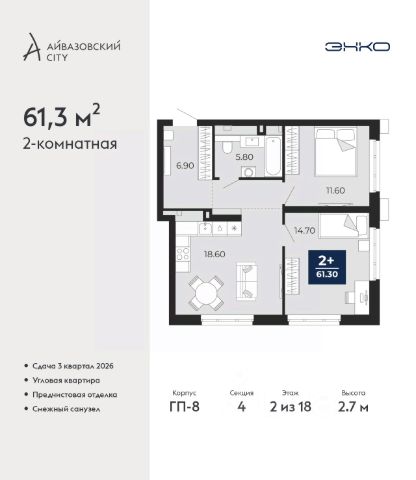 2-комн. квартира с предчистовой отделкой в ЖК "Республики 205" на 9 этаже. Общая площадь: 60.2 кв.м., жилая: 24 кв.м., площадь просторной кухни-гостиной: 17.8 кв.м. Комнаты изолированные, все окна выходят на одну сторону. В квартире одна лоджия, один совмещенный и один раздельный санузел. Высота потолков 2.6 м.
