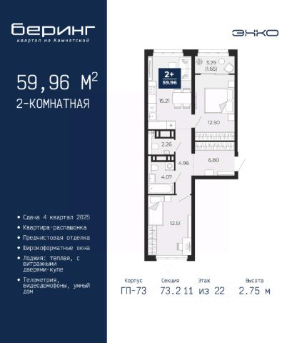 Просторная двухкомнатная квартира с предчистовой отделкой в ЖК "Дом у озера" на 3 этаже. Общая площадь: 54.64 кв.м., жилая: 21.5 кв.м., площадь просторной кухни-гостиной: 15 кв.м. Угловая квартира, очень светлая, естественная вентиляция при открытии окон. В квартире одна лоджия, один совмещенный санузел. Высота потолков 2.7 м. Дом монолитный, многоподъездный, переменной этажности, от 2 до 8 этажей. Квартира находится в 3-й секции высотой 8 этажей в корпусе 3. На этаже 7 квартир. В подъезде 1 грузовой лифт. Окончание строительства - 2 квартал 2027 года. Оформление сделки по договору долевого участия. Квартира с кухней-гостиной и двумя спальнями в Доме у озера. Особенности планировки: предчистовая отделка. квартиры в нашей базе: ДМУ03-Ж3.3.2. "Дом у озера" является продолжением "Европейского квартала". Он расположен в центре заречного района города. В 2030 году здесь появится квартал, состоящий из урбан-вилл, таунхаусов, секционных домов и башни. Вокруг уже сформирована необходимая инфраструктура: детские сады, школы, спортивный комплекс, продуктовые магазины, аптеки, кофейни, рестораны и салоны красоты. Путь до центра города занимает 7 минут на машине. Озеро Тихое — ценный рекреационный ресурс. Брусника вернула ему прежнее значение и сделала новой точкой притяжения для жителей микрорайона. Ключевым элементом концепции благоустройства стала вода. В каждой части квартала архитекторы нашли для нее свою форму. Вдоль пешеходных улиц разместили искусственные ручьи, на центральной площади — фонтан и дождевые сады. Основная точка притяжения жителей — озеро и выходящий на его сторону променад. Здесь мы организуем смотровые площадки и расположим летние террасы кафе и ресторанов. Тесную связь застройки с ландшафтом обеспечивает многоуровневое озеленение. Буфер из деревьев и кустарников по периметру квартала превращается в естественный ветрозащитный экран. Такое решение позволяет создать на территории "Дома у озера" комфортный микроклимат. Подъезды "Дома у озера" с прозрачными входными группами и большими лифтами. Для мест общего пользования архитекторы разработали новую интерьерную коллекцию, вдохновленную эклектичными восточными мотивами. В отделке сочетаются коричневый, желтый и белый цвета, повторяющие колористические решения фасадов. Декоративные перегородки, установленные в лобби, напоминают машрабию — элемент арабской архитектуры в виде узорной решетки. За счет мягкой мебели, многоуровневого освещения теплых оттенков и предметов декора (например, зеркал и картин) холлы воспринимаются как продолжение квартиры. #zM4b59 Продается 2-комнатная квартира с лоджией в Тюменской области.