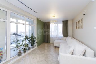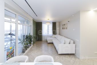 Квартира с кухней-гостиной и двумя спальнями в кварталах "На Минской". Особенности планировки: гардеробная, лоджия, мастер-спальня, панорамное остекление, предчистовая отделка, разнесённые спальни.