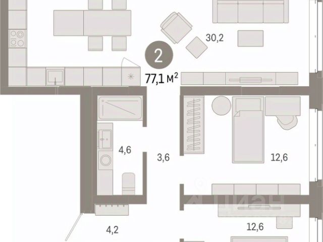 Просторная двухкомнатная квартира с предчистовой отделкой в Кварталы "На Минской" на 4 этаже. Общая площадь: 80.54 кв.м., жилая: 26.3 кв.м., площадь просторной кухни-гостиной: 24 кв.м. Квартира угловая, окна oбecпeчивaют paвнoмepнoe ocвeщeниe в тeчeниe дня. В квартире один балкон, два совмещенных санузла. Терраса представляет собой роскошную зону отдыха для проведение вечеров в кругу семьи и друзей или организация вечеринок. Высота потолков 2.7 м. Дом монолитный, многоподъездный, переменной этажности, от 7 до 16 этажей. Квартира находится в 3-й секции высотой 7 этажей в корпусе 1. На этаже 5 квартир. В подъезде 1 грузовой лифт. Окончание строительства - 4 квартал 2026 года. Оформление сделки по договору долевого участия. Квартира с кухней-гостиной и двумя спальнями в кварталах "На Минской". Особенности планировки: балкон, предчистовая отделка, разнесённые спальни. квартиры в нашей базе: МНС01-Ж3.4.4. В сердце города Кварталы "На Минской" находятся в самом центре. За десять минут можно дойти до площади 400-летия Тюмени и Большого Драматического театра, Тюменского индустриального и медицинского университетов, спортивного комплекса "Строймаш", ТРЦ "Гудвин" и "Премьер", Тюменского технопарка. Поблизости много детских садов, школ и поликлиник. Пространство разного опыта Создавая кварталы "На Минской" мы вдохновлялись Хакскими дворами в Берлине и улицей Давида Агмашенебели в Тбилиси. И первые и вторая — яркие разнообразные пространства, сформированные прогрессивными архитекторами и притягивающие городских интеллектуалов. Престижная недвижимость здесь соседствует с барами, ресторанами, креативными кластерами и бюро, дизайнерскими лавками. Полезные улицы Кварталы "На Минской" свяжет сеть променадов, автомобильных проездов и велодорожек. Уличный фронт проекта мы сформируем с помощью аллейной посадки деревьев. Они создадут тень для ресторанов и кафе на первых этажах, визуально отделят проезжую и пешеходную части, снизят объём пыли и уровень шума. Мы реализуем проект в районе с развитой базовой инфраструктурой. И поэтому тщательно подошли к программированию коммерции, посчитав, что её основная задача — "закрывать" более высокие потребности жителей. Здесь может появиться пекарня с вкусными круассанами, турагентство на случай, если захочется перезимовать в Сочи, массажный кабинет, ресторан, когда надоело есть дома и многое другое. #zS9bba Продается 2-комнатная квартира в микрорайоне Драмтеатр (Ленинский) в городе Тюмень.