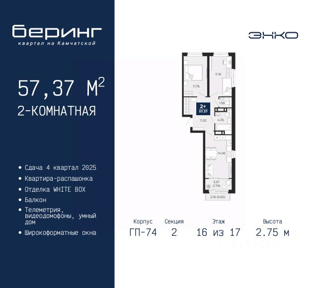 Продается 2-комн. квартира в ЖК "Беринг" на 16 этаже. Квартира без отделки, полностью готова к чистовой отделке и дальнейшему ремонту. Общая площадь: 57.37 кв.м., жилая: 22.92 кв.м., площадь просторной кухни-столовой: 14.56 кв.м. Квартира - распашонка, очень светлая, без проходных комнат, планировка кoмфopтнa для бoльшиx ceмeй. В квартире один балкон, один совмещенный и один раздельный санузел. Высота потолков 2.75 м. Дом монолитный, многоподъездный, переменной этажности, от 9 до 21 этажей. Квартира находится во 2-й секции высотой 17 этажей в корпусе ГП-74. На этаже 7 квартир. В подъезде 1 пассажирский и 1 грузовой лифт. Окончание строительства - 4 квартал 2025 года. Оформление сделки по договору долевого участия. Подобно знаменитому исследователю, мы чувствуем себя первооткрывателями этой локации. Хотим показать новую суть места, сформировать для вас жизненный опыт, которого ещё не было. Беринг — район зелёного цвета. Беринг — район, который откроется вам с другой стороны. Впечатлит новым уровнем комфорта и качеством жизни. Беринг — открытие на карте города. Первый квартал расположен в районе Тура, в границах улиц: Камчатская Западносибирская Энтузиастов. Вокруг уже есть всё для того, чтобы ежедневная рутина была лишь частью жизни и не доставляла дискомфорта. Школы и детские сады, магазины и аптеки, поликлиника, места для семейного отдыха, пеших и велопрогулок, и даже рыбалки. Масштабное озеленение дворов — визитная карточка ЭНКО и ваш оазис спокойствия, чтобы отвлечься от повседневности. Раскидистые деревья, кустарники, травы и цветы — осталось остановиться, вдохнуть и расслабиться, глядя на эту природную красоту. Стилистика подъездов продолжает концепцию Беринга, вдохновлённого Камчаткой: сдержанный, но при этом впечатляющий дизайн соседствует с удобством и функциональностью. #23smff Купить 2-комнатную квартиру в микрорайоне Энтузиастов в городе Тюмень.