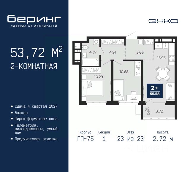 Двухкомнатная квартира с предчистовой отделкой в ЖК "Беринг" на 10 этаже. Общая площадь: 50.42 кв.м., жилая: 22.6 кв.м., площадь просторной кухни-столовой: 15.11 кв.м. Комнаты изолированные, все окна выходят на одну сторону. В квартире один балкон, один совмещенный санузел. Высота потолков 2.72 м. Дом монолитный, черырехподъездный, переменной этажности, от 19 до 24 этажей. Квартира находится во 2-й секции высотой 19 этажей в корпусе ГП-76. На этаже 8 квартир. В подъезде 1 пассажирский и 1 грузовой лифт. Окончание строительства - 4 квартал 2027 года. Оформление сделки по договору долевого участия. Подобно знаменитому исследователю, мы чувствуем себя первооткрывателями этой локации. Хотим показать новую суть места, сформировать для вас жизненный опыт, которого ещё не было. Беринг — район зелёного цвета. Беринг — район, который откроется вам с другой стороны. Впечатлит новым уровнем комфорта и качеством жизни. Беринг — открытие на карте города. Первый квартал расположен в районе Тура, в границах улиц: Камчатская Западносибирская Энтузиастов. Вокруг уже есть всё для того, чтобы ежедневная рутина была лишь частью жизни и не доставляла дискомфорта. Школы и детские сады, магазины и аптеки, поликлиника, места для семейного отдыха, пеших и велопрогулок, и даже рыбалки. Масштабное озеленение дворов — визитная карточка ЭНКО и ваш оазис спокойствия, чтобы отвлечься от повседневности. Раскидистые деревья, кустарники, травы и цветы — осталось остановиться, вдохнуть и расслабиться, глядя на эту природную красоту. Стилистика подъездов продолжает концепцию Беринга, вдохновлённого Камчаткой: сдержанный, но при этом впечатляющий дизайн соседствует с удобством и функциональностью. #zm6cMv Купить 2-комнатную квартиру в микрорайоне Энтузиастов в городе Тюмень.
