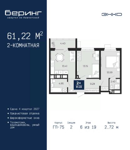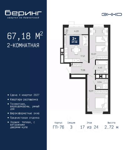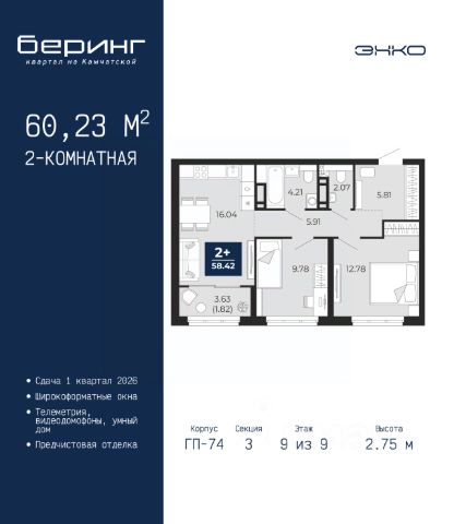 Успейте оформить бронирование на этих условиях, срок предложения ограничен! Стоимость квартиры указана со скидкой, ваша экономия составит 844,145 руб. По всем вопросам обращайтесь в офис продаж, мы вам все подробно расскажем. 2-комн. квартира с предчистовой отделкой в ЖК "Беринг" на 12 этаже. Общая площадь: 61.99 кв.м., жилая: 21.58 кв.м., площадь просторной кухни-столовой: 16.21 кв.м. Комнаты изолированные, все окна выходят на одну сторону. В квартире один балкон и одна лоджия, один совмещенный и один раздельный санузел. Высота потолков 2.75 м. Дом монолитный, многоподъездный, переменной этажности, от 9 до 22 этажей. Квартира находится в 4-й секции высотой 12 этажей в корпусе ГП-73. На этаже 8 квартир. В подъезде 1 пассажирский и 1 грузовой лифт. Окончание строительства - 1 квартал 2026 года. Оформление сделки по договору долевого участия. Подобно знаменитому исследователю, мы чувствуем себя первооткрывателями этой локации. Хотим показать новую суть места, сформировать для вас жизненный опыт, которого ещё не было. Беринг — район зелёного цвета. Беринг — район, который откроется вам с другой стороны. Впечатлит новым уровнем комфорта и качеством жизни. Беринг — открытие на карте города. Первый квартал расположен в районе Тура, в границах улиц: Камчатская Западносибирская Энтузиастов. Вокруг уже есть всё для того, чтобы ежедневная рутина была лишь частью жизни и не доставляла дискомфорта. Школы и детские сады, магазины и аптеки, поликлиника, места для семейного отдыха, пеших и велопрогулок, и даже рыбалки. Масштабное озеленение дворов — визитная карточка ЭНКО и ваш оазис спокойствия, чтобы отвлечься от повседневности. Раскидистые деревья, кустарники, травы и цветы — осталось остановиться, вдохнуть и расслабиться, глядя на эту природную красоту. Стилистика подъездов продолжает концепцию Беринга, вдохновлённого Камчаткой: сдержанный, но при этом впечатляющий дизайн соседствует с удобством и функциональностью. #2MeOz1 Купить 2-комнатную квартиру в микрорайоне Энтузиастов в городе Тюмень.