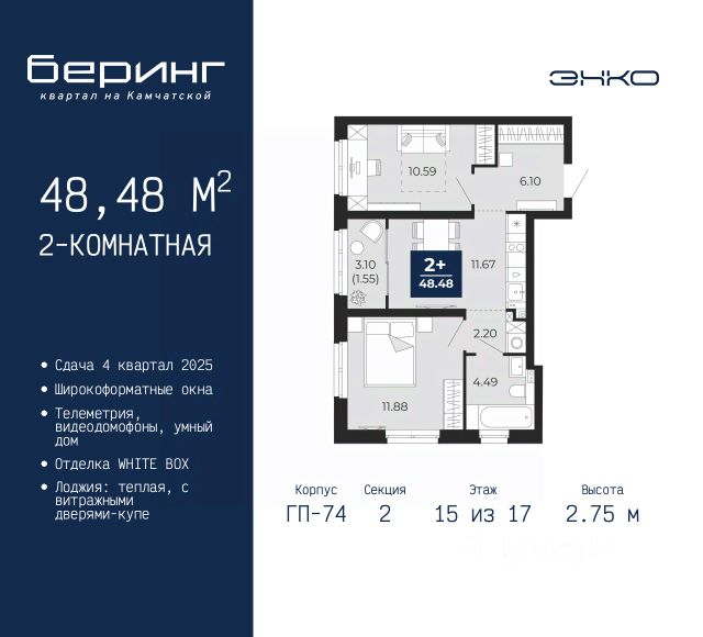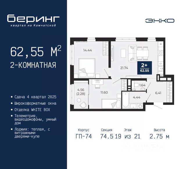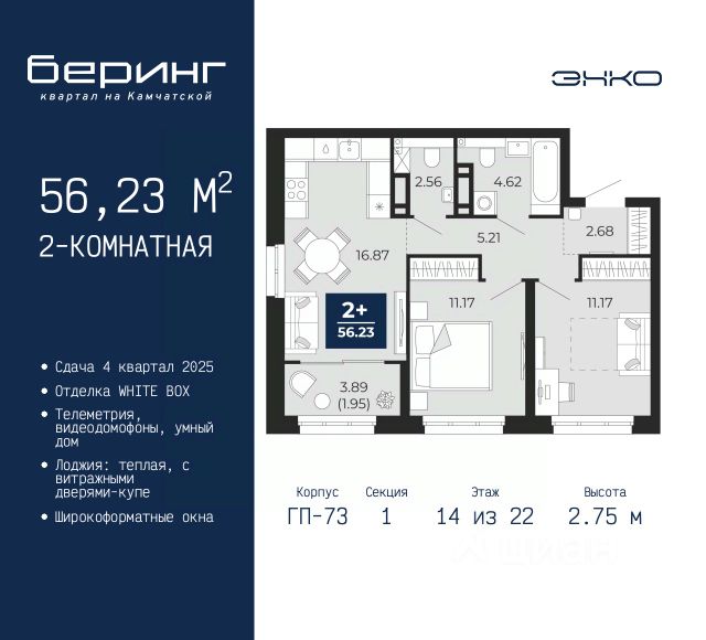 Просторная 2-комн. квартира в ЖК "Беринг" на 13 этаже. Квартира без отделки, новый владелец может сделать ремонт по индивидуальному проекту. Общая площадь: 57.78 кв.м., жилая: 21.58 кв.м., площадь просторной кухни-столовой: 16.23 кв.м. Комнаты изолированные, все окна выходят на одну сторону. В квартире одна лоджия, один совмещенный и один раздельный санузел. Высота потолков 2.75 м. Дом монолитный, многоподъездный, переменной этажности, от 9 до 22 этажей. Квартира находится в 73.3-й секции высотой 16 этажей в корпусе ГП-73. На этаже 8 квартир. В подъезде 1 пассажирский и 1 грузовой лифт. Окончание строительства - 4 квартал 2025 года. Оформление сделки по договору долевого участия. Подобно знаменитому исследователю, мы чувствуем себя первооткрывателями этой локации. Хотим показать новую суть места, сформировать для вас жизненный опыт, которого ещё не было. Беринг — район зелёного цвета. Беринг — район, который откроется вам с другой стороны. Впечатлит новым уровнем комфорта и качеством жизни. Беринг — открытие на карте города. Первый квартал расположен в районе Тура, в границах улиц: Камчатская Западносибирская Энтузиастов. Вокруг уже есть всё для того, чтобы ежедневная рутина была лишь частью жизни и не доставляла дискомфорта. Школы и детские сады, магазины и аптеки, поликлиника, места для семейного отдыха, пеших и велопрогулок, и даже рыбалки. Масштабное озеленение дворов — визитная карточка ЭНКО и ваш оазис спокойствия, чтобы отвлечься от повседневности. Раскидистые деревья, кустарники, травы и цветы — осталось остановиться, вдохнуть и расслабиться, глядя на эту природную красоту. Стилистика подъездов продолжает концепцию Беринга, вдохновлённого Камчаткой: сдержанный, но при этом впечатляющий дизайн соседствует с удобством и функциональностью. #Z3S6Dw Продается 2-комнатная квартира в микрорайоне Энтузиастов в городе Тюмень.
