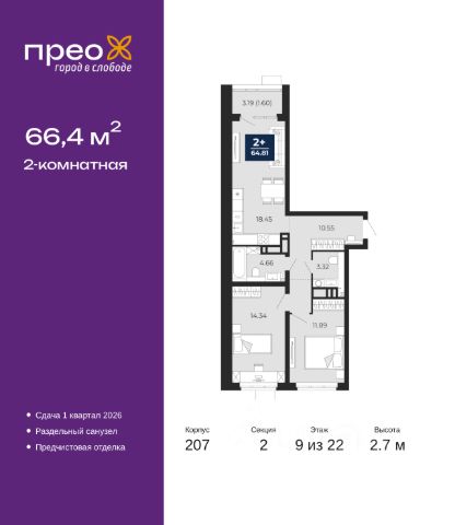Дом монолитный, трехподъездный, переменной этажности, от 14 до 22 этажей. Квартира находится в 3-й секции высотой 14 этажей в корпусе 208. На этаже 6 квартир. В подъезде 1 пассажирский и 1 грузовой лифт. Окончание строительства - 1 квартал 2026 года. Оформление сделки по договору долевого участия.