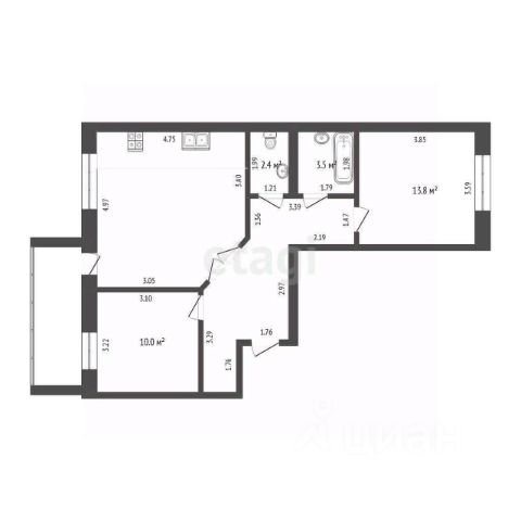 Квартира общей площадью 65,7 кв.м. с продуманным зонированием: