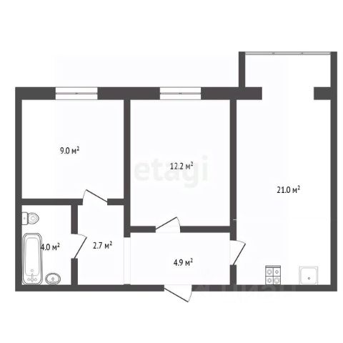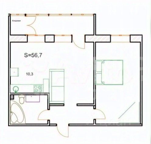 Просторная утепленная лоджия с выходом из Кухни-гостиной, где располагается удобная для хранения закрытая кладовая (внутри металлический стеллаж и большая тумба).