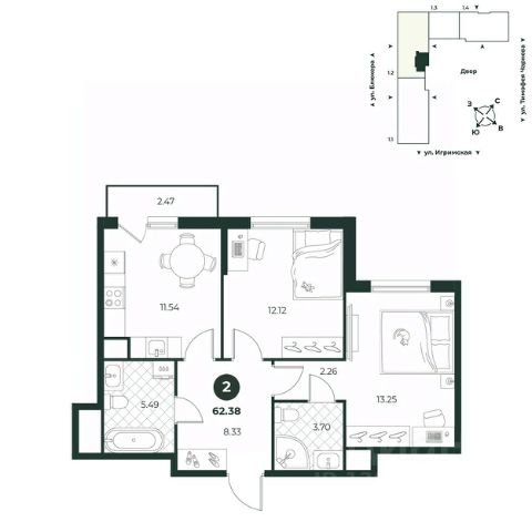 Двухкомнатная квартира с мастер-спальней и двумя санузлами. Площадь одного позволяет установить стиральную и сушильную машины. Комнаты правильной формы. Из кухни предусмотрен выход на французский балкон.