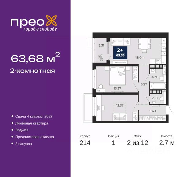 2-комн. квартира с предчистовой отделкой в ЖК "Прео" на 2 этаже. Общая площадь: 68.68 кв.м., жилая: 28.41 кв.м., площадь просторной кухни-столовой: 24.59 кв.м. Комнаты изолированные, все окна выходят на одну сторону. В квартире два совмещенных санузла. Высота потолков 2.7 м. Дом монолитный, двухподъездный, переменной этажности, от 12 до 20 этажей. Квартира находится в 1-й секции высотой 12 этажей в корпусе 214. На этаже 8 квартир. В подъезде 1 пассажирский и 1 грузовой лифт. Окончание строительства - 4 квартал 2027 года. Оформление сделки по договору долевого участия. Преображенский — один из самых привлекательных районов для жизни! Это полностью самостоятельный жилой район с точки зрения инфраструктуры. Преображенский находится между Московским и Червишевским трактами в квартале улиц Закалужская — Вьюжная — Александра Протозанова. Не нужно ждать, когда появится инфраструктура — переезжайте на всё готовое. Вблизи расположены действующие школа и детский сад. В этом году откроется еще один сад, а в следующем году — школа. По соседству с Преображенским запланировано строительство городского парка "Комарово" площадью 38 гектар. За 10 минут можно доехать на автомобиле до крупных ТРЦ: "Лента", "Кристалл", "Леруа Мерлен", "Метро" и "Ашан". С 2018 года в районе открыт Соседский центр — пространство, созданное для формирования добрососедской среды, совместного досуга, общения и реализации соседских инициатив. Здесь проходят встречи соседей, а также сами жители района организовывают мероприятия. Организатором такого события может стать любой желающий. В квартирах выполнена качественная предчистовая отделка. Гладкие стены с финишным выравниванием по маякам. Ровный потолок для установки натяжного потолка. Установлены пятикамерные окна с двойным стеклопакетом (3 стекла). Дизайнерские холлы с видеонаблюдением, безбарьерным и прозрачным входом всегда светло и спокойно. На первом этаже есть просторные колясочные, где все жители могут оставлять свои коляски и велосипеды. В Преображенском есть всё, что нужно для активного отдыха и занятий спортом. Мы сделали большое футбольное поле с безопасным покрытием. Также установили хоккейный корт, который оборудован по всем необходимым стандартам. Во дворах можно делать упражнения на специальных площадках с турниками. Весь район мы обустроили велодорожками, которые связаны в единый маршрут. У нас есть сухие фонтаны, бьющие из земли, деревья, веревки, сетки, скалодром, газон, песок и резинка — осталось просто дать своему ребенку право на свободную игру. По-настоящему хорошие дворы — это те, которые дети предпочитают соцсетям и телевизору. Аккредитация в банках: "Сбербанк России", ОАО "Альфа-Банк", ПАО Банк "ВТБ", ПАО "Банк Уралсиб", ПАО "Газпромбанк" и других. #Zmv9vZ Продам 2-комнатную квартиру в микрорайоне Тюменская Слобода в городе Тюмень.