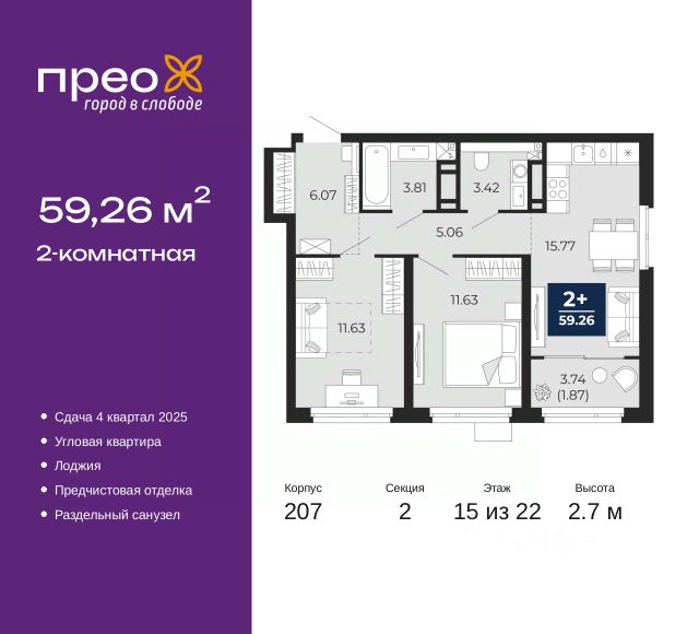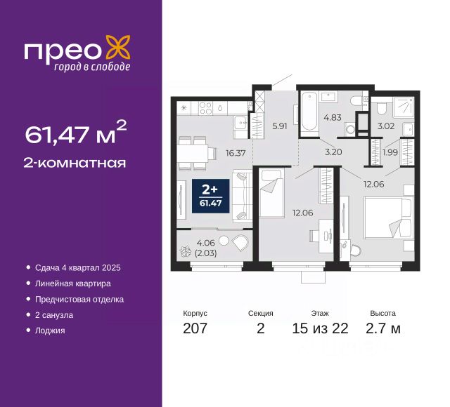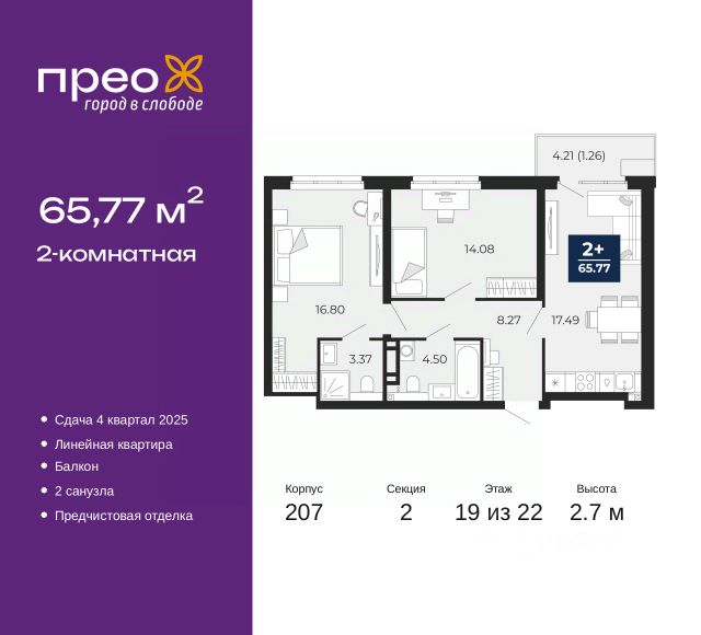 Продается двухкомнатная квартира с предчистовой отделкой в ЖК "Прео" на 13 этаже. Общая площадь: 64.81 кв.м., жилая: 26.23 кв.м., площадь просторной кухни-столовой: 18.45 кв.м. Квартира - распашонка, без проходных комнат, окна выходят на paзные стороны дома. В квартире один балкон, один совмещенный и один раздельный санузел. Высота потолков 2.7 м. Дом монолитный, двухподъездный, высотой 22 этажа. Квартира находится во 2-й секции в корпусе 207. На этаже 8 квартир. В подъезде 1 пассажирский и 1 грузовой лифт. Окончание строительства - 4 квартал 2025 года. Оформление сделки по договору долевого участия. Преображенский — один из самых привлекательных районов для жизни! Это полностью самостоятельный жилой район с точки зрения инфраструктуры. Преображенский находится между Московским и Червишевским трактами в квартале улиц Закалужская — Вьюжная — Александра Протозанова. Не нужно ждать, когда появится инфраструктура — переезжайте на всё готовое. Вблизи расположены действующие школа и детский сад. В этом году откроется еще один сад, а в следующем году — школа. По соседству с Преображенским запланировано строительство городского парка "Комарово" площадью 38 гектар. За 10 минут можно доехать на автомобиле до крупных ТРЦ: "Лента", "Кристалл", "Леруа Мерлен", "Метро" и "Ашан". С 2018 года в районе открыт Соседский центр — пространство, созданное для формирования добрососедской среды, совместного досуга, общения и реализации соседских инициатив. Здесь проходят встречи соседей, а также сами жители района организовывают мероприятия. Организатором такого события может стать любой желающий. В квартирах выполнена качественная предчистовая отделка. Гладкие стены с финишным выравниванием по маякам. Ровный потолок для установки натяжного потолка. Установлены пятикамерные окна с двойным стеклопакетом (3 стекла). Дизайнерские холлы с видеонаблюдением, безбарьерным и прозрачным входом всегда светло и спокойно. На первом этаже есть просторные колясочные, где все жители могут оставлять свои коляски и велосипеды. В Преображенском есть всё, что нужно для активного отдыха и занятий спортом. Мы сделали большое футбольное поле с безопасным покрытием. Также установили хоккейный корт, который оборудован по всем необходимым стандартам. Во дворах можно делать упражнения на специальных площадках с турниками. Весь район мы обустроили велодорожками, которые связаны в единый маршрут. У нас есть сухие фонтаны, бьющие из земли, деревья, веревки, сетки, скалодром, газон, песок и резинка — осталось просто дать своему ребенку право на свободную игру. По-настоящему хорошие дворы — это те, которые дети предпочитают соцсетям и телевизору. Аккредитация в банках: "Сбербанк России", ОАО "Альфа-Банк", ПАО "Банк Уралсиб", ПАО "Газпромбанк", ПАО Банк "ВТБ" и других. #zufZDU Продам 2-комнатную квартиру в микрорайоне Тюменская Слобода в городе Тюмень.