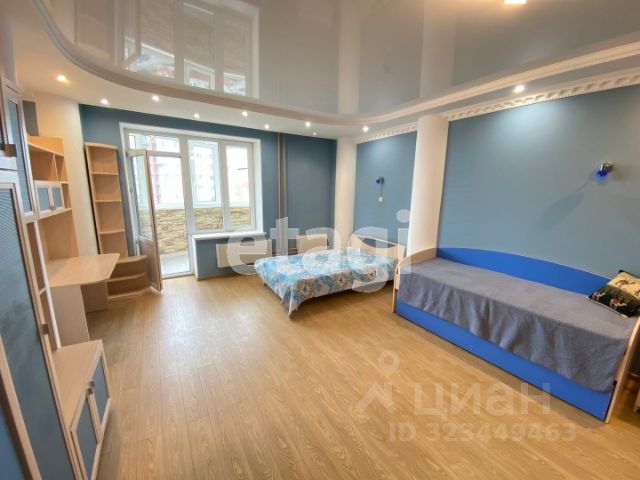 В квартире остаются все необходимые для комфортной жизни вещи: кухонный гарнитур с посудомоечной машиной, барная стойка со стульями, диван, встроенный шкаф, детская кровать, стеллаж и комод.