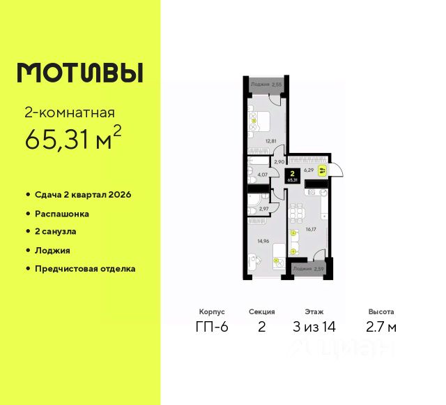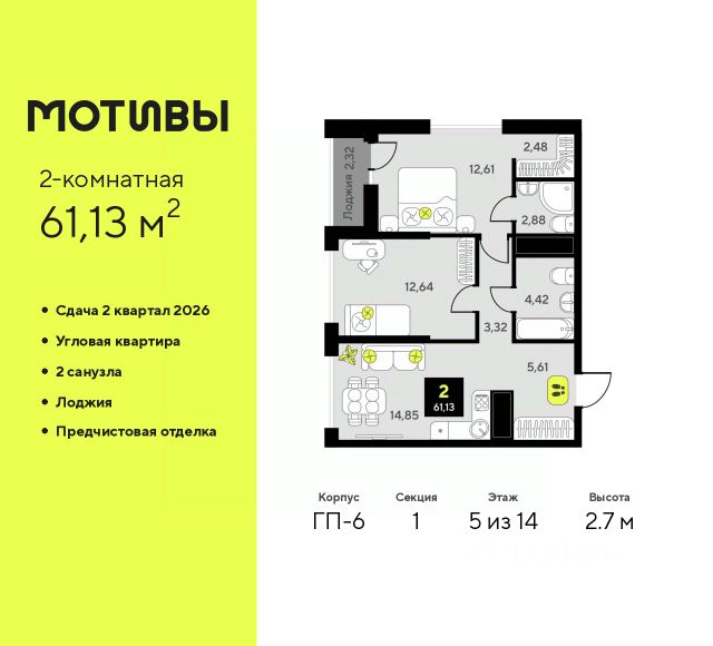 Продается 2-комн. квартира с предчистовой отделкой в ЖК "Мотивы" на 7 этаже. Общая площадь: 60.48 кв.м., жилая: 25.48 кв.м., площадь просторной кухни-столовой: 15.02 кв.м. Комнаты изолированные, все окна выходят на одну сторону. В квартире одна лоджия, два совмещенных санузла. Высота потолков 2.7 м. Квартира будет сдаваться с предчистовой отделкой White Box: выровнены и оштукатурены стены, проведено электричество и отопление, установлены радиаторы. Вы также можете приобрести квартиру с ремонтом от застройщика, представленным в трех цветовых решениях Scandi, Wood и Coffee и включающим ламинат, обои под покраску, двери, натяжной потолок и санузел с сантехникой. При желании вы можете заказать отделку под ключ, варианты возможных решений представлены в альбоме фотографий. Дом монолитный, черырехподъездный, переменной этажности, от 12 до 14 этажей. Квартира находится во 2-й секции высотой 14 этажей в корпусе ГП-3. На этаже 12 квартир. В подъезде 1 пассажирский и 1 грузовой лифт. На сегодняшний день строительство завершено, дом сдан в 4 квартале 2024 года. Оформление сделки по договору купли-продажи. Закрытая от автомобилей территория, безопасный двор и камеры видеонаблюдения - гаранты вашего спокойствия. Квартал будет располагать богатой инфраструктурой: на первых этажах разместятся магазины, пекарни, кофейни, пункты выдачи, аптеки, детские центры, цветочные салоны и многое другое, что сделает жизнь поистине комфортной. Рядом находится парк общей площадью почти 5000 м², в котором располагаются локации для игр и отдыха жителей, здесь можно совершить утреннюю пробежку или прогуляться после рабочего дня. В парке есть зона воркаута с тренажерами для взрослых, игровые комплексы с горками и канатный комплекс для детей разных возрастов, качели и лавочки для отдыха, площадки для командных видов спорта и для панна-футбола. В ЖК "Мотивы" всё продумано до мелочей: светлые холлы входных групп, оформленные в едином стиле, просторные колясочные, лапомойки для питомцев. На территории комплекса находятся 2 8-ми этажных паркинга и более 1000 м/м на открытой парковке. Жилой комплекс находится в одном из экологически благоприятных районов Тюмени, недалеко от Плехановского бора. При этом до центра города можно добраться за 15 минут, а до международного аэропорта Рощино за 13 минут. Окончание строительства: ГП 1, 2, 3, 4 сдача до конца 2024 года, ГП 6, 7, 8 сдача 2 квартал 2026 года. #2wAgaS