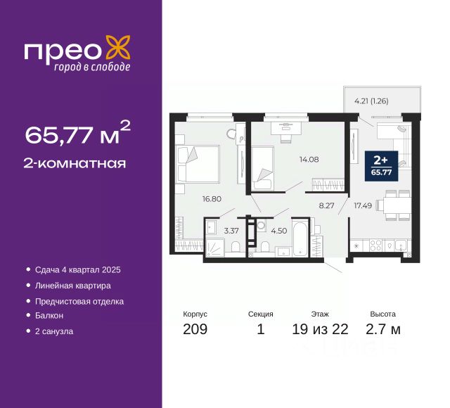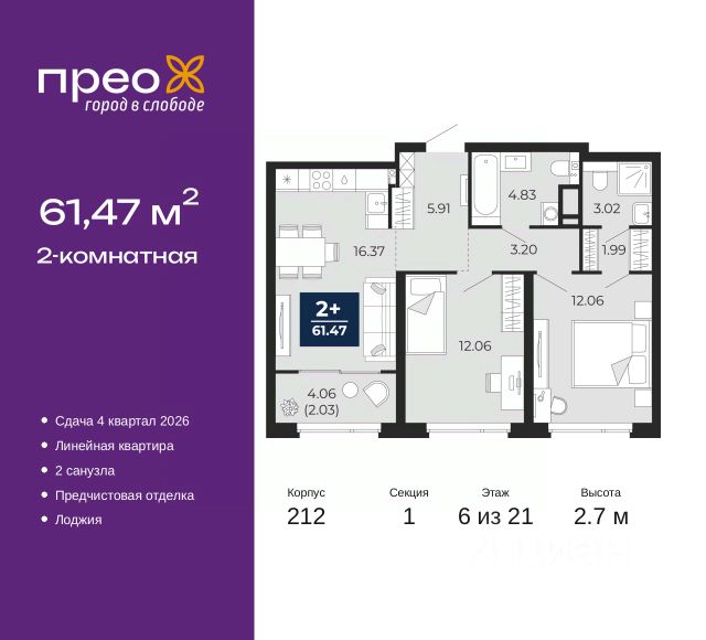 Просторная двухкомнатная квартира с предчистовой отделкой в ЖК "Прео" на 1 этаже. Общая площадь: 60.62 кв.м., жилая: 23.26 кв.м., площадь просторной кухни-столовой: 15.77 кв.м. Комнаты изолированные, все окна выходят на одну сторону. В квартире одна лоджия, один совмещенный и один раздельный санузел. Высота потолков 2.7 м. Квартира находится в корпусе 212. Дом монолитный, одноподъездный, высотой 21 этаж. На этаже 8 квартир. В подъезде 2 пассажирских и 1 грузовой лифт. Окончание строительства - 4 квартал 2026 года. Оформление сделки по договору долевого участия. Преображенский — один из самых привлекательных районов для жизни! Это полностью самостоятельный жилой район с точки зрения инфраструктуры. Преображенский находится между Московским и Червишевским трактами в квартале улиц Закалужская — Вьюжная — Александра Протозанова. Не нужно ждать, когда появится инфраструктура — переезжайте на всё готовое. Вблизи расположены действующие школа и детский сад. В этом году откроется еще один сад, а в следующем году — школа. По соседству с Преображенским запланировано строительство городского парка "Комарово" площадью 38 гектар. За 10 минут можно доехать на автомобиле до крупных ТРЦ: "Лента", "Кристалл", "Леруа Мерлен", "Метро" и "Ашан". С 2018 года в районе открыт Соседский центр — пространство, созданное для формирования добрососедской среды, совместного досуга, общения и реализации соседских инициатив. Здесь проходят встречи соседей, а также сами жители района организовывают мероприятия. Организатором такого события может стать любой желающий. В квартирах выполнена качественная предчистовая отделка. Гладкие стены с финишным выравниванием по маякам. Ровный потолок для установки натяжного потолка. Установлены пятикамерные окна с двойным стеклопакетом (3 стекла). Дизайнерские холлы с видеонаблюдением, безбарьерным и прозрачным входом всегда светло и спокойно. На первом этаже есть просторные колясочные, где все жители могут оставлять свои коляски и велосипеды. В Преображенском есть всё, что нужно для активного отдыха и занятий спортом. Мы сделали большое футбольное поле с безопасным покрытием. Также установили хоккейный корт, который оборудован по всем необходимым стандартам. Во дворах можно делать упражнения на специальных площадках с турниками. Весь район мы обустроили велодорожками, которые связаны в единый маршрут. У нас есть сухие фонтаны, бьющие из земли, деревья, веревки, сетки, скалодром, газон, песок и резинка — осталось просто дать своему ребенку право на свободную игру. По-настоящему хорошие дворы — это те, которые дети предпочитают соцсетям и телевизору. Аккредитация в банках: ПАО "Газпромбанк", ПАО Банк "ВТБ", ПАО "Банк Уралсиб", ОАО "Альфа-Банк", "Сбербанк России" и других. #ZSEg5o Купить 2-комнатную квартиру на улице Арктическая в городе Тюмень.
