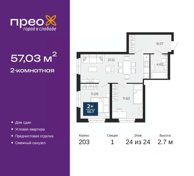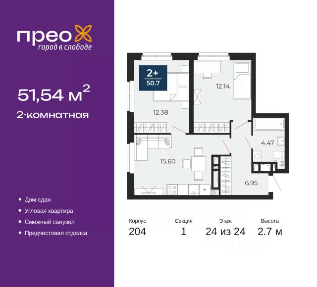Продается 2-комн. квартира с предчистовой отделкой в ЖК "Прео" на 24 этаже. Общая площадь: 51.54 кв.м., жилая: 24.52 кв.м., площадь просторной кухни-столовой: 15.6 кв.м. Квартира угловая, окна oбecпeчивaют paвнoмepнoe ocвeщeниe в тeчeниe дня. В квартире один совмещенный санузел. Высота потолков 2.7 м. Квартира находится в корпусе 204. Дом монолитный, одноподъездный, высотой 24 этажа. На этаже 14 квартир. В подъезде 2 грузовых лифта. В настоящее время строительство завершено, дом сдан в 4 квартале 2024 года. Оформление сделки по договору купли-продажи. Преображенский — один из самых привлекательных районов для жизни! Это полностью самостоятельный жилой район с точки зрения инфраструктуры. Преображенский находится между Московским и Червишевским трактами в квартале улиц Закалужская — Вьюжная — Александра Протозанова. Не нужно ждать, когда появится инфраструктура — переезжайте на всё готовое. Вблизи расположены действующие школа и детский сад. В этом году откроется еще один сад, а в следующем году — школа. По соседству с Преображенским запланировано строительство городского парка "Комарово" площадью 38 гектар. За 10 минут можно доехать на автомобиле до крупных ТРЦ: "Лента", "Кристалл", "Леруа Мерлен", "Метро" и "Ашан". С 2018 года в районе открыт Соседский центр — пространство, созданное для формирования добрососедской среды, совместного досуга, общения и реализации соседских инициатив. Здесь проходят встречи соседей, а также сами жители района организовывают мероприятия. Организатором такого события может стать любой желающий. В квартирах выполнена качественная предчистовая отделка. Гладкие стены с финишным выравниванием по маякам. Ровный потолок для установки натяжного потолка. Установлены пятикамерные окна с двойным стеклопакетом (3 стекла). Дизайнерские холлы с видеонаблюдением, безбарьерным и прозрачным входом всегда светло и спокойно. На первом этаже есть просторные колясочные, где все жители могут оставлять свои коляски и велосипеды. В Преображенском есть всё, что нужно для активного отдыха и занятий спортом. Мы сделали большое футбольное поле с безопасным покрытием. Также установили хоккейный корт, который оборудован по всем необходимым стандартам. Во дворах можно делать упражнения на специальных площадках с турниками. Весь район мы обустроили велодорожками, которые связаны в единый маршрут. У нас есть сухие фонтаны, бьющие из земли, деревья, веревки, сетки, скалодром, газон, песок и резинка — осталось просто дать своему ребенку право на свободную игру. По-настоящему хорошие дворы — это те, которые дети предпочитают соцсетям и телевизору. Аккредитация в банках: "Сбербанк России", ПАО "Газпромбанк", ПАО Банк "ВТБ", ОАО "Альфа-Банк", ПАО "Банк Уралсиб" и других. #ZZc4VE Продается 2-комнатная квартира на улице Фармана Салманова в городе Тюмень.