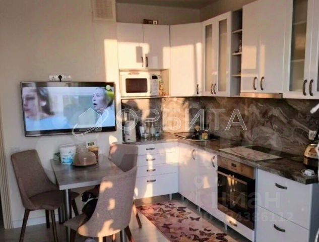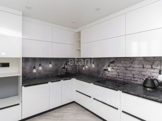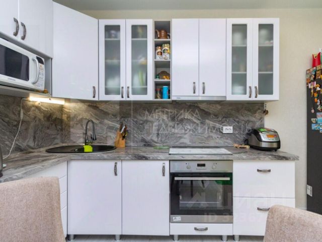 Панорамный балкон, шикарный вид на город. Остается всё что на фото: кухонная мебель, встроенная бытовая техника, холодильник Samsung, свч Samsung, телевизор LG на кронштейне, стиральная машина LG, шторы на карнизах.