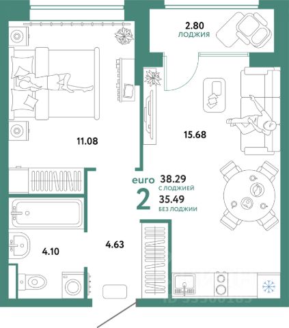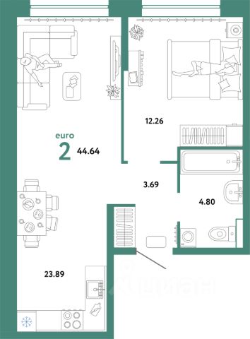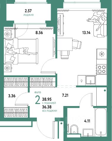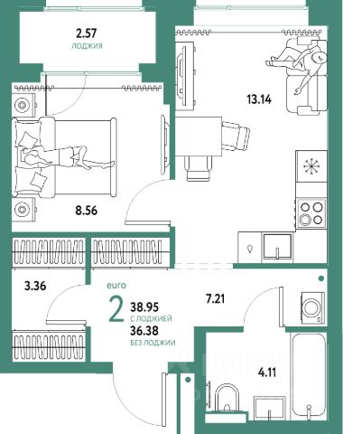 Квартира площадью 56,9 кв.м., с кухней гостиной площадью 16 кв.м. в новом современном районе города ЖК " Домашний".