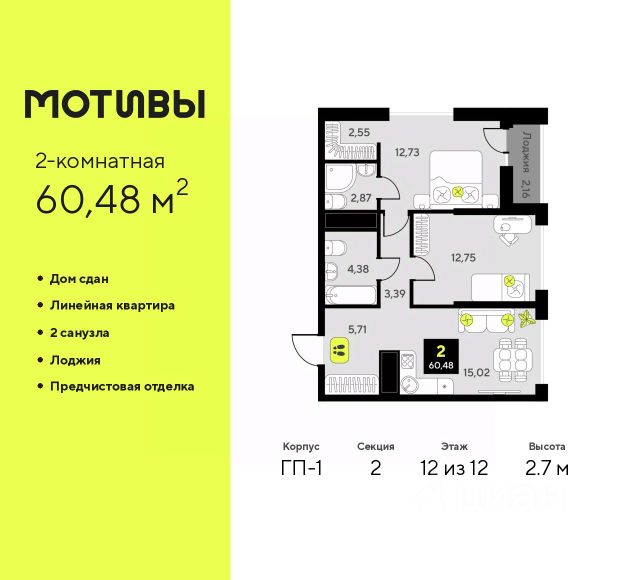 Просторная 2-комн. квартира с предчистовой отделкой в ЖК "Мотивы" на 12 этаже. Общая площадь: 53.95 кв.м., жилая: 24.24 кв.м., площадь просторной кухни-столовой: 20.1 кв.м. Комнаты изолированные, все окна выходят на одну сторону. В квартире одна лоджия, один совмещенный санузел. Высота потолков 2.7 м. Квартира будет сдаваться с предчистовой отделкой White Box: выровнены и оштукатурены стены, проведено электричество и отопление, установлены радиаторы. Вы также можете приобрести квартиру с ремонтом от застройщика, представленным в трех цветовых решениях Scandi, Wood и Coffee и включающим ламинат, обои под покраску, двери, натяжной потолок и санузел с сантехникой. При желании вы можете заказать отделку под ключ, варианты возможных решений представлены в альбоме фотографий. Дом монолитный, двухподъездный, переменной этажности, от 12 до 14 этажей. Квартира находится во 2-й секции высотой 12 этажей в корпусе ГП-1. На этаже 12 квартир. В подъезде 1 пассажирский и 1 грузовой лифт. Строительство окончено, дом сдан в 4 квартале 2024 года. Оформление сделки по договору купли-продажи. Закрытая от автомобилей территория, безопасный двор и камеры видеонаблюдения - гаранты вашего спокойствия. Квартал будет располагать богатой инфраструктурой: на первых этажах разместятся магазины, пекарни, кофейни, пункты выдачи, аптеки, детские центры, цветочные салоны и многое другое, что сделает жизнь поистине комфортной. Рядом находится парк общей площадью почти 5000 м², в котором располагаются локации для игр и отдыха жителей, здесь можно совершить утреннюю пробежку или прогуляться после рабочего дня. В парке есть зона воркаута с тренажерами для взрослых, игровые комплексы с горками и канатный комплекс для детей разных возрастов, качели и лавочки для отдыха, площадки для командных видов спорта и для панна-футбола. В ЖК "Мотивы" всё продумано до мелочей: светлые холлы входных групп, оформленные в едином стиле, просторные колясочные, лапомойки для питомцев. На территории комплекса находятся 2 8-ми этажных паркинга и более 1000 м/м на открытой парковке. Жилой комплекс находится в одном из экологически благоприятных районов Тюмени, недалеко от Плехановского бора. При этом до центра города можно добраться за 15 минут, а до международного аэропорта Рощино за 13 минут. Окончание строительства: ГП 1, 2, 3, 4 сдача до конца 2024 года, ГП 6, 7, 8 сдача 2 квартал 2026 года. #zWEO3m