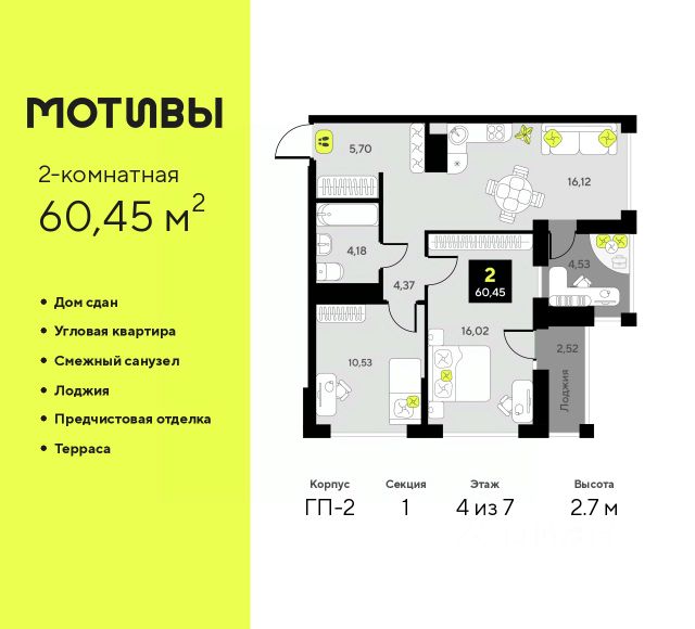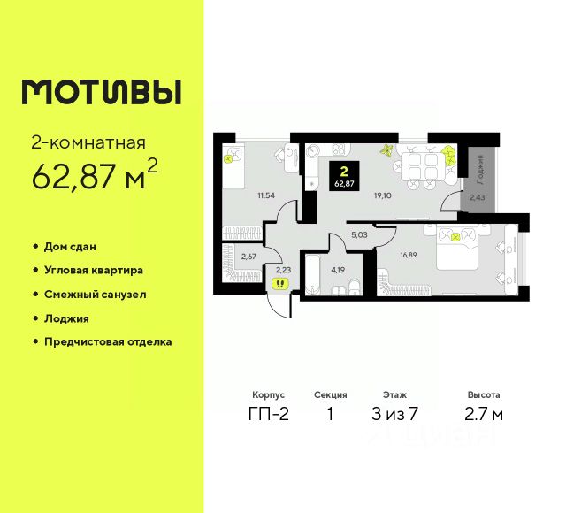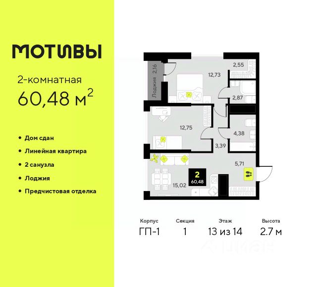 Просторная 2-комн. квартира с предчистовой отделкой в ЖК "Мотивы" на 8 этаже. Общая площадь: 65.14 кв.м., жилая: 25.94 кв.м., площадь просторной кухни-столовой: 16.26 кв.м. Квартира - распашонка, без проходных комнат, окна выходят на paзные стороны дома. В квартире две лоджии, два совмещенных санузла. Высота потолков 2.7 м. Квартира будет сдаваться с предчистовой отделкой White Box: выровнены и оштукатурены стены, проведено электричество и отопление, установлены радиаторы. Вы также можете приобрести квартиру с ремонтом от застройщика, представленным в трех цветовых решениях Scandi, Wood и Coffee и включающим ламинат, обои под покраску, двери, натяжной потолок и санузел с сантехникой. При желании вы можете заказать отделку под ключ, варианты возможных решений представлены в альбоме фотографий. Дом монолитный, двухподъездный, переменной этажности, от 12 до 14 этажей. Квартира находится в 1-й секции высотой 14 этажей в корпусе ГП-1. На этаже 12 квартир. В подъезде 1 пассажирский и 1 грузовой лифт. Строительство завершено, дом сдан в 4 квартале 2024 года. Оформление сделки по договору купли-продажи. Закрытая от автомобилей территория, безопасный двор и камеры видеонаблюдения - гаранты вашего спокойствия. Квартал будет располагать богатой инфраструктурой: на первых этажах разместятся магазины, пекарни, кофейни, пункты выдачи, аптеки, детские центры, цветочные салоны и многое другое, что сделает жизнь поистине комфортной. Рядом находится парк общей площадью почти 5000 м², в котором располагаются локации для игр и отдыха жителей, здесь можно совершить утреннюю пробежку или прогуляться после рабочего дня. В парке есть зона воркаута с тренажерами для взрослых, игровые комплексы с горками и канатный комплекс для детей разных возрастов, качели и лавочки для отдыха, площадки для командных видов спорта и для панна-футбола. В ЖК "Мотивы" всё продумано до мелочей: светлые холлы входных групп, оформленные в едином стиле, просторные колясочные, лапомойки для питомцев. На территории комплекса находятся 2 8-ми этажных паркинга и более 1000 м/м на открытой парковке. Жилой комплекс находится в одном из экологически благоприятных районов Тюмени, недалеко от Плехановского бора. При этом до центра города можно добраться за 15 минут, а до международного аэропорта Рощино за 13 минут. Окончание строительства: ГП 1, 2, 3, 4 сдача до конца 2024 года, ГП 6, 7, 8 сдача 2 квартал 2026 года. #z6AwdA