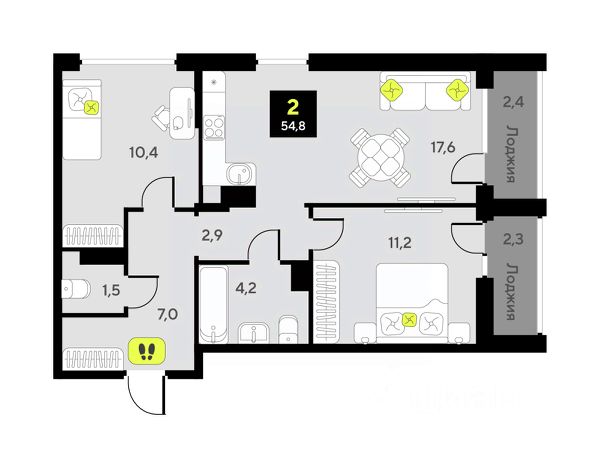 Продается двухкомнатная квартира с предчистовой отделкой в ЖК "Дивный квартал у озера" на 5 этаже. Общая площадь: 56.9 кв.м., жилая: 24.6 кв.м., площадь просторной кухни-столовой: 17.2 кв.м. Угловая квартира, очень светлая, естественная вентиляция при открытии окон. В квартире две лоджии, один совмещенный и один раздельный санузел. Высота потолков 2.7 м. Квартира будет сдаваться с предчистовой отделкой White Box: выровнены и оштукатурены стены, проведено электричество и отопление, установлены радиаторы. Вы также можете приобрести квартиру с ремонтом от застройщика, представленным в трех цветовых решениях Scandi, Wood и Coffee и включающим: ламинат, обои под покраску, двери, натяжной потолок, санузел с сантехникой. При желании вы можете заказать отделку под ключ, варианты возможных решений представлены в альбоме фотографий. Дом монолитный, черырехподъездный, переменной этажности, от 7 до 9 этажей. Квартира находится в 4-й секции высотой 9 этажей в корпусе ГП-5. На этаже 5 квартир. В подъезде 1 пассажирский и 1 грузовой лифт. Окончание строительства - 4 квартал 2025 года. Оформление сделки по договору долевого участия. "Дивный квартал у озера" современный жилой квартал, удобно расположенный в 10-ти минутах от центра Тюмени, в уютном районе рядом с зеленым массивом и озером Алебашево. Комплекс находится между улицами Мельникайте и Алебашевская, что обеспечивает его хорошую транспортную доступность до центра на автомобиле всего 10 минут. Рядом с комплексом расположен Лесопарк имени Гагарина, экзотический Парк дружбы между Россией и Республикой Корея. "Дивный квартал у озера" объединяет архитектуру современной городской застройки и природную эстетику. Уютные дворы жилого комплекса будут не только безопасными, но и тихими. Закрытая территория надёжно защищена от шума и посторонних глаз. Здесь будут места для отдыха, детские площадки, зоны для выгула собак. В холлах первого этажа расположены мягкая зона ожидания, общественные санузлы и просторная колясочная. Квартал будет располагать богатой инфраструктурой: на первых этажах домов разместятся магазины, пекарни, кофейни, пункты выдачи, аптеки, детские центры, цветочные салоны и многое другое, что сделает жизнь поистине комфортной. В комплексе есть теплый подземный паркинг и кладовые. #zM9aCE