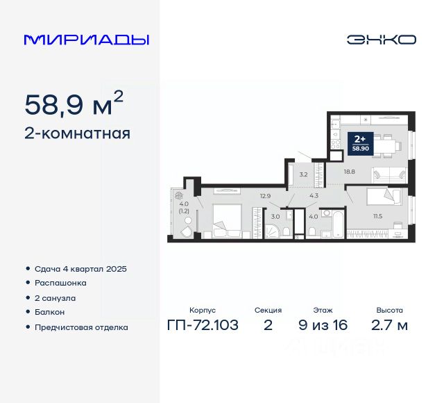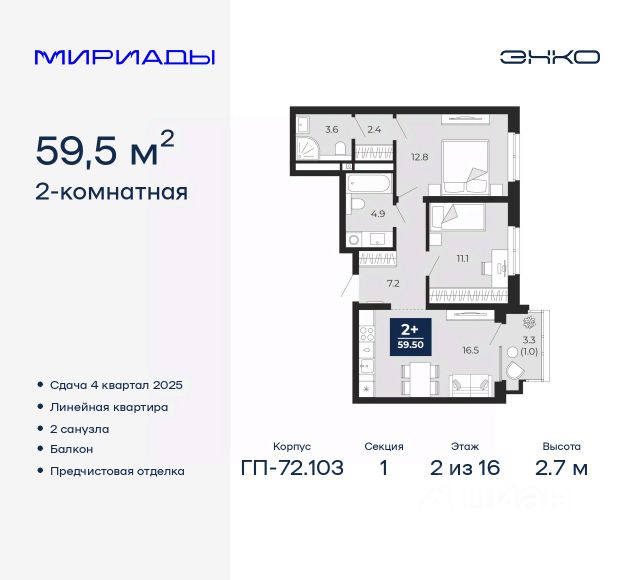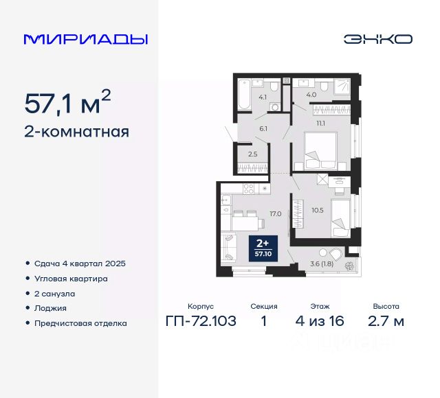 2-комн. квартира с предчистовой отделкой в ЖК "Мириады" на 11 этаже. Общая площадь: 54.3 кв.м., жилая: 21.7 кв.м., площадь просторной кухни-столовой: 19.4 кв.м. Квартира угловая, очень светлая, естественная вентиляция при открытии окон. В квартире одна лоджия, один раздельный санузел. Высота потолков 2.7 м. Дом монолитный, трехподъездный, переменной этажности, от 14 до 16 этажей. Квартира находится в 1-й секции высотой 16 этажей в корпусе ГП-72.103. На этаже 8 квартир. В подъезде 1 пассажирский и 1 грузовой лифт. Окончание строительства - 4 квартал 2025 года. Оформление сделки по договору долевого участия. Вселенная бесконечных историй. Ранее невиданный Тюмени масштаб: территория 240 гектаров и 1 650 000 м² застройки. Мириады это город масштабных перемен и больших возможностей. Город зеленых рощ и зеркальных озер. Город для работы, учебы и развлечений. Город для детей и их родителей. Город для всех и каждого. Проект расположен в районе Мыс рядом с ТРЦ "Тюмень Сити Молл" в границах улицы Тимофея Чаркова, Тобольского тракта и объездной дороги. Срок полного освоения территории - до 2034 года. #zMtEuO Продается 2-комнатная квартира на улице Тимофея Чаркова в городе Тюмень.